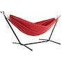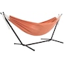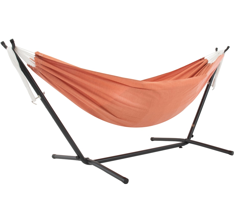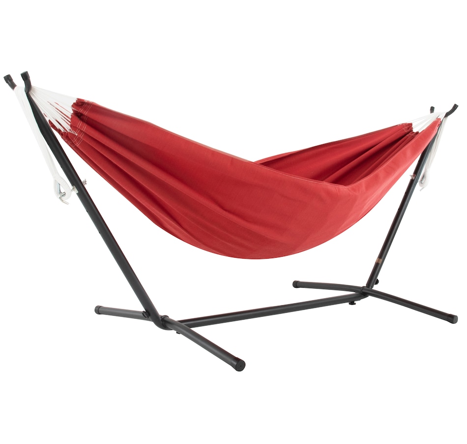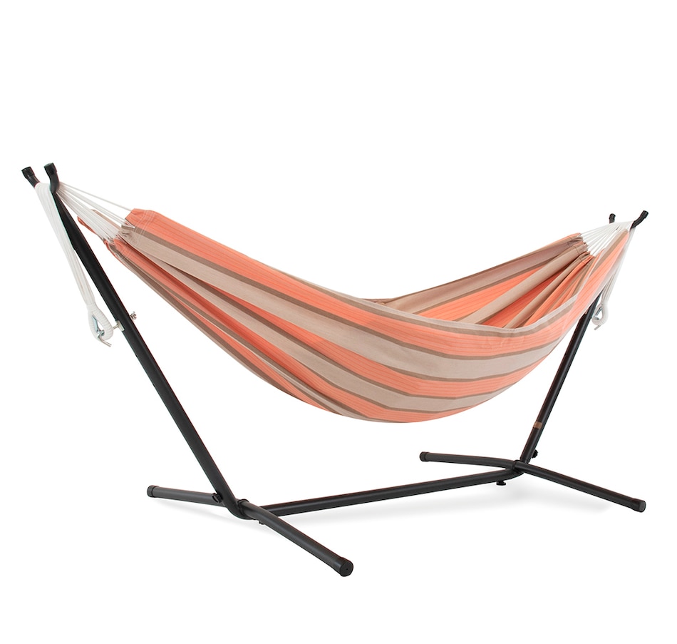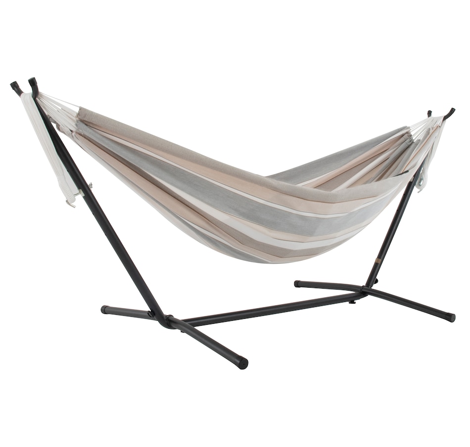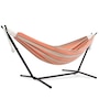 The Double Sunbrella® Hammock and Stand Combo is our top choice to challenge the elements. The double hammock is made with Sunbrella® fabric to outlast every season, year after year. It is as comfortable as cotton, creating the perfect refuge for an afternoon snuggle. The stand is constructed of heavy duty steel and assembles in minutes without any tools. The zinc-coated legs prevent rust and plastic caps top the ends of the steel tubing to create a soft finish. The stand provides you the freedom to setup your hammock in the most convenient location and the premium carry bag included makes it easier than ever to travel with your new hammock and stand. The double Sunbrella® hammock is made of solution-dyed acrlyic yarns that resist UV, fading, staining, and mildew.