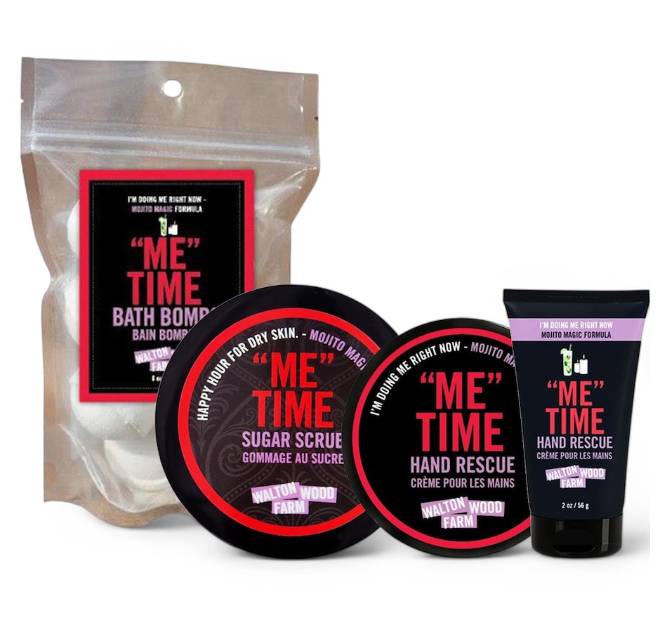 This bundle includes a soothing Hand Rescue tub and travel size, decadent Bath Bombs, and a delightful Sugar Scrub, Perfect for a little "Me-Time"!