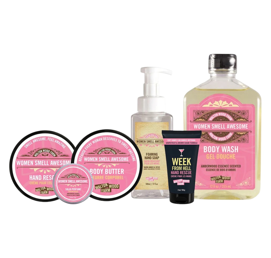 This bundle includes a soothing hand rescue tub and travel size, body wash, hand wash, body butter, and solid perfume. Everything to celebrate your awesome self or the other awesome women in your life!