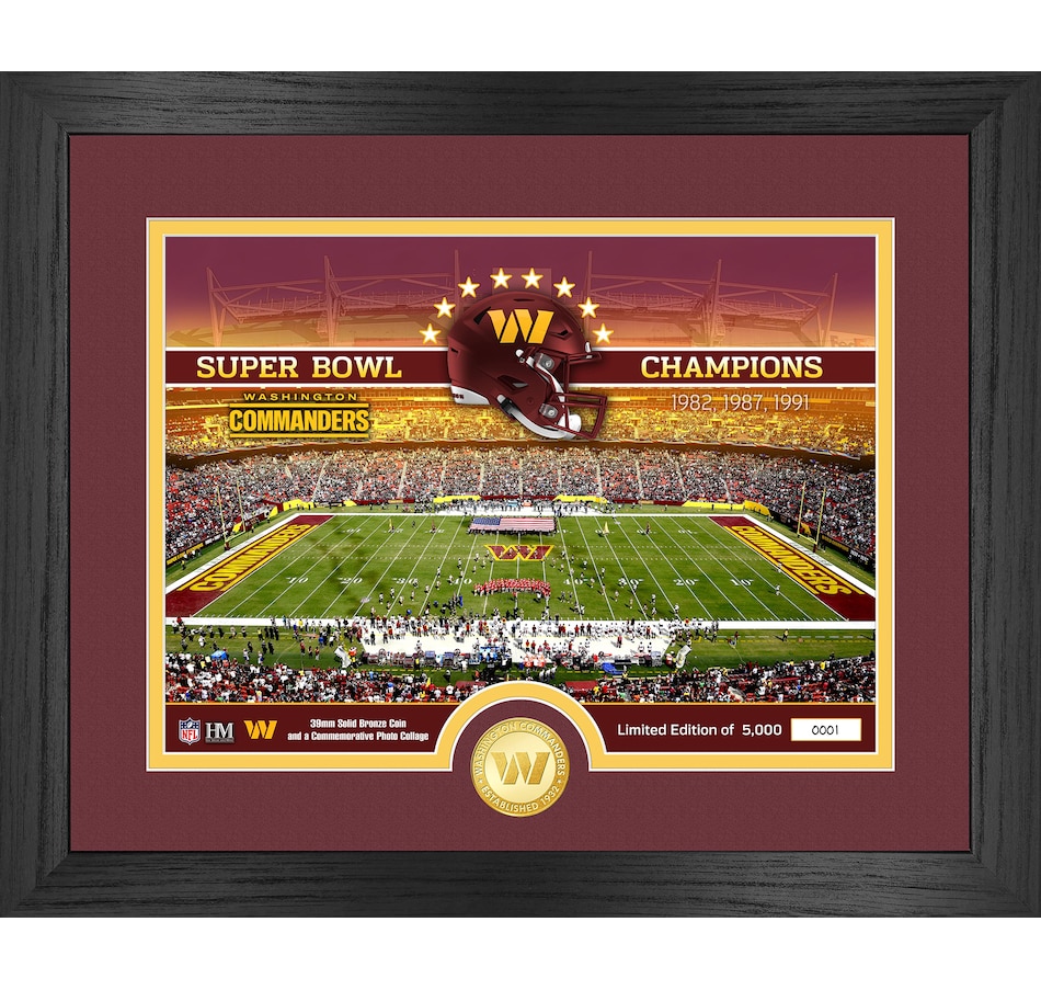 This limited edition 13" x 16" frame features, in double matting and under glass, a hand numbered 8" x 10" custom print commemorating the NFL's Washington Commanders combined with a 39mm minted bronze team coin. As a limited edition of only 5000 and officially licensed by the NFL, each one is accompanied by a certificate of authenticity. This product is proudly made in the U.S.A. by The Highland Mint.