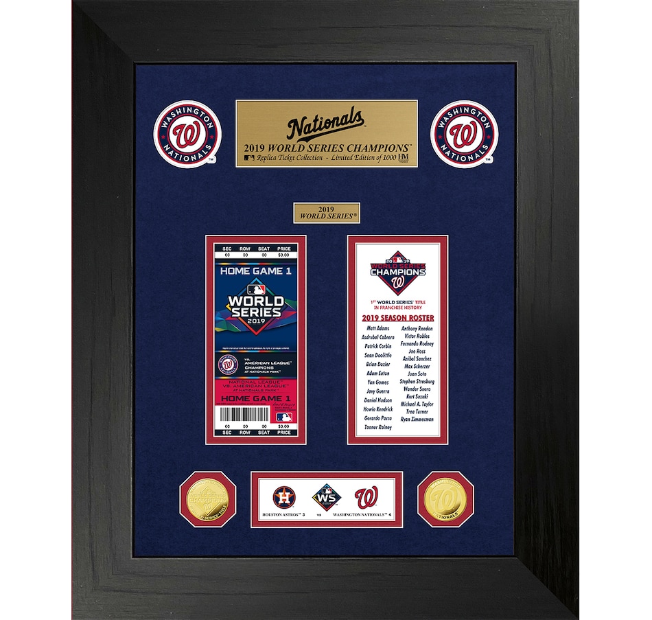 This procust is available in a limited edition of only 1000 made! Featured in a black 18" x 22" wood frame and double matting is the Washington Nationals commemorative World Series ticket collection! This collectible frame is highlighted with a gold plate 39mm Nationals 1-time World Series Champions commemorative coin and a gold plate 39mm team coin. Also matted in the frame are engraved nameplates and die cut team logos. Each frame has an individually numbered certificate of authenticity adhered to the back. This fantastic collectible is officially licensed by the MLB and proudly made in the U.S.A by The Highland Mint!