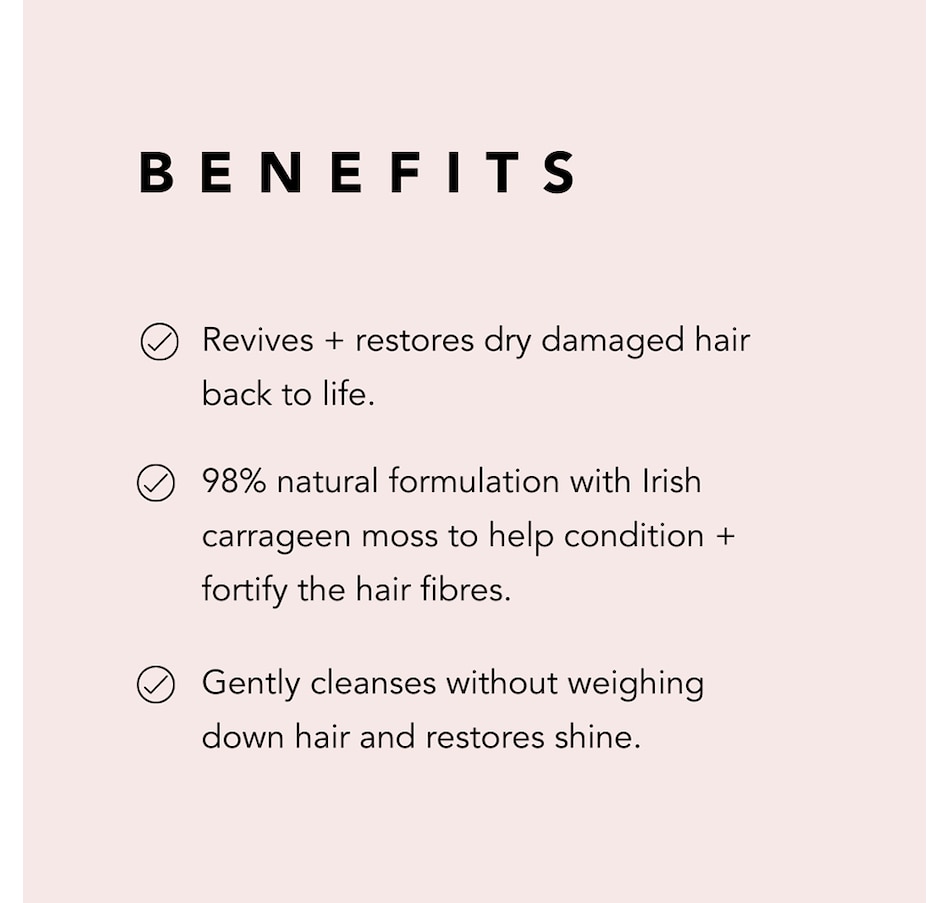 Bring your hair back to life with this 98% natural Repair Shampoo designed for dry or damaged hair. Gently cleanses without weighing down hair and restores shine. Carrageen Moss helps condition and fortify hair fibres.