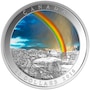 Through the innovative use of diffused technology and vivid paint, this coin presents a snapshot of a beautiful rainbow on a stormy day. The design features rolling hills in the background, a farmhouse and barn sit atop a slope where a road leads to two round bales in the foreground. The rainbow descends from the dark storm clouds above in radiant colours. A faint glow appears above the rainbow, as the rain tapers off. The appearance of blue sky can be seen in the break between the clouds behind the rainbow. The addition of innovative colour technology and various finishing techniques allows the vivid hues of the rainbow to come through.