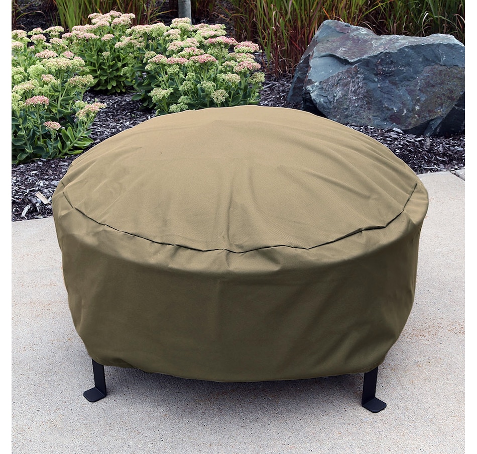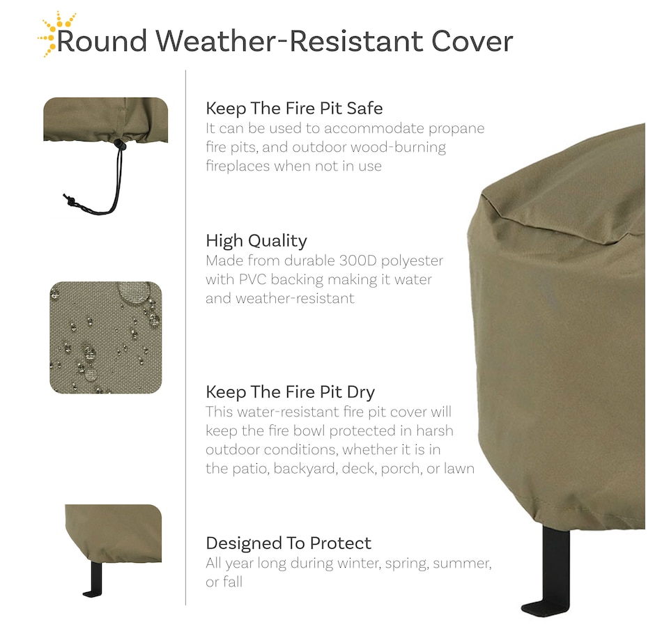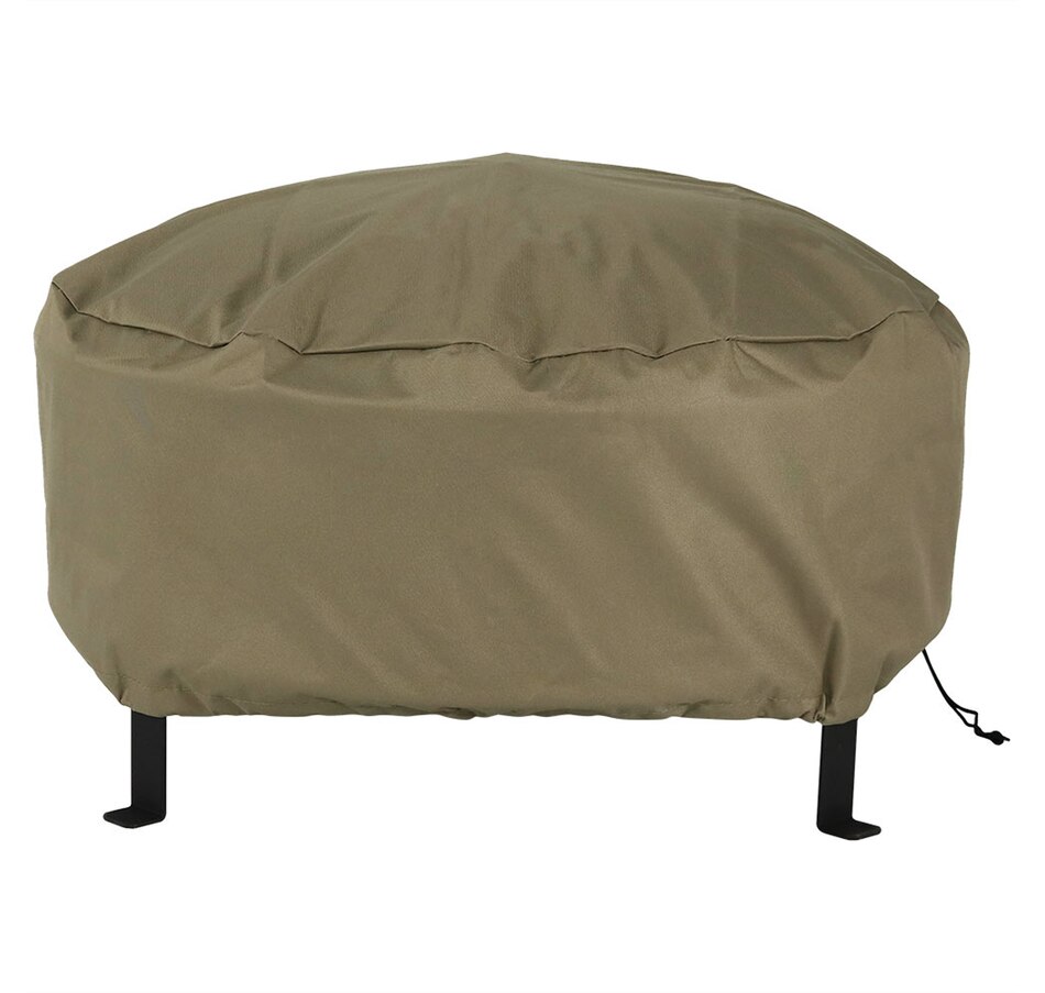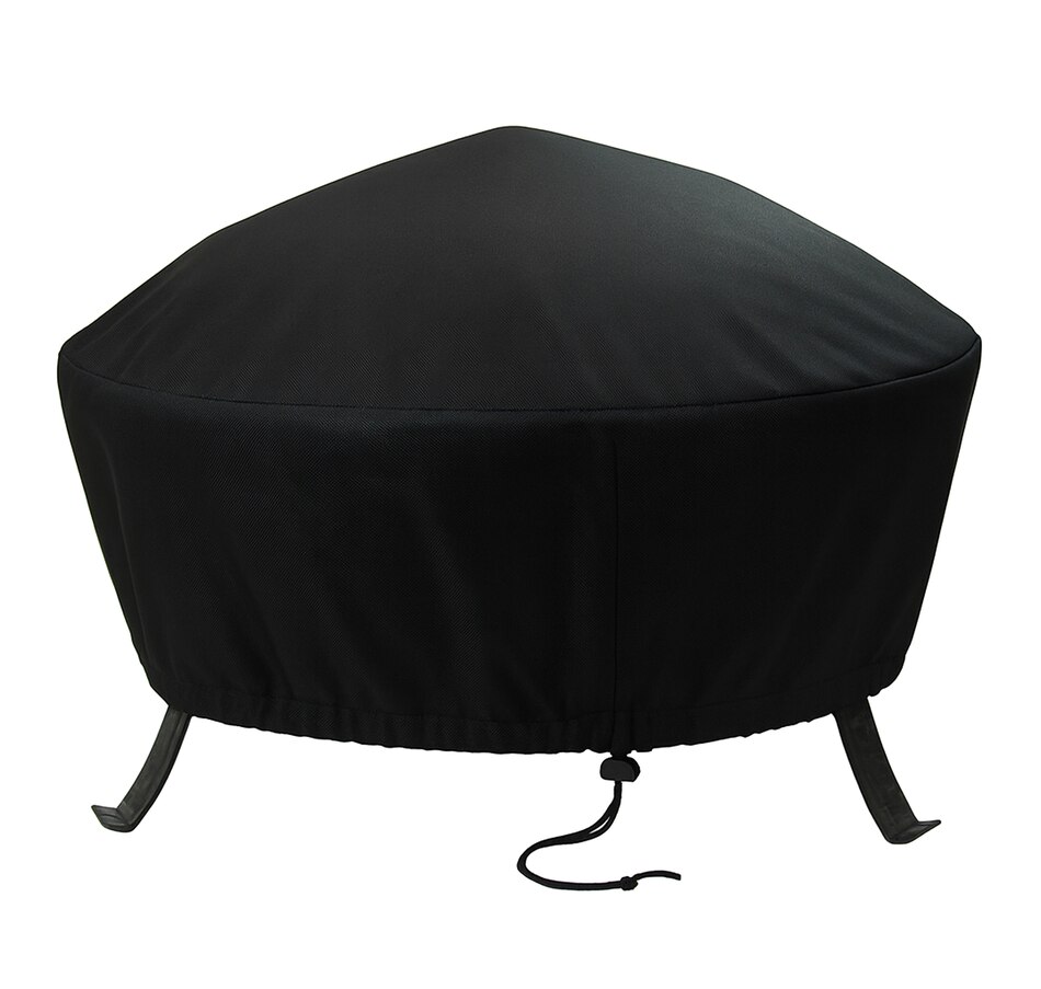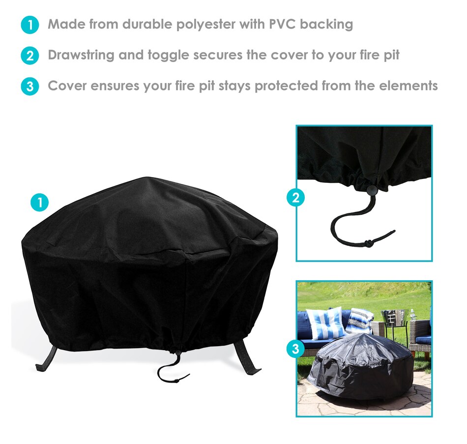 Keep the fire pit safe throughout the year despite weather, wear, and extensive use with this durable and round fire pit cover. Water and weather-resistant, this heavy-duty, round fire pit cover is made from 300D polyester with PVC backing. The PVC backing ensures durability and ability to withstand the elements. This cover features a convenient drawstring and toggle tie at the bottom to allow the cover to adjust for the right fit and securely strap the cover to the fire pit. If the fire pit is taller than the cover, don't worry! Simply use the drawstring to secure under the bowl and know that the cover does not need to cover the legs of the fire pit.