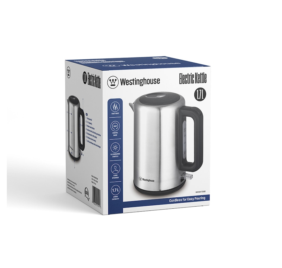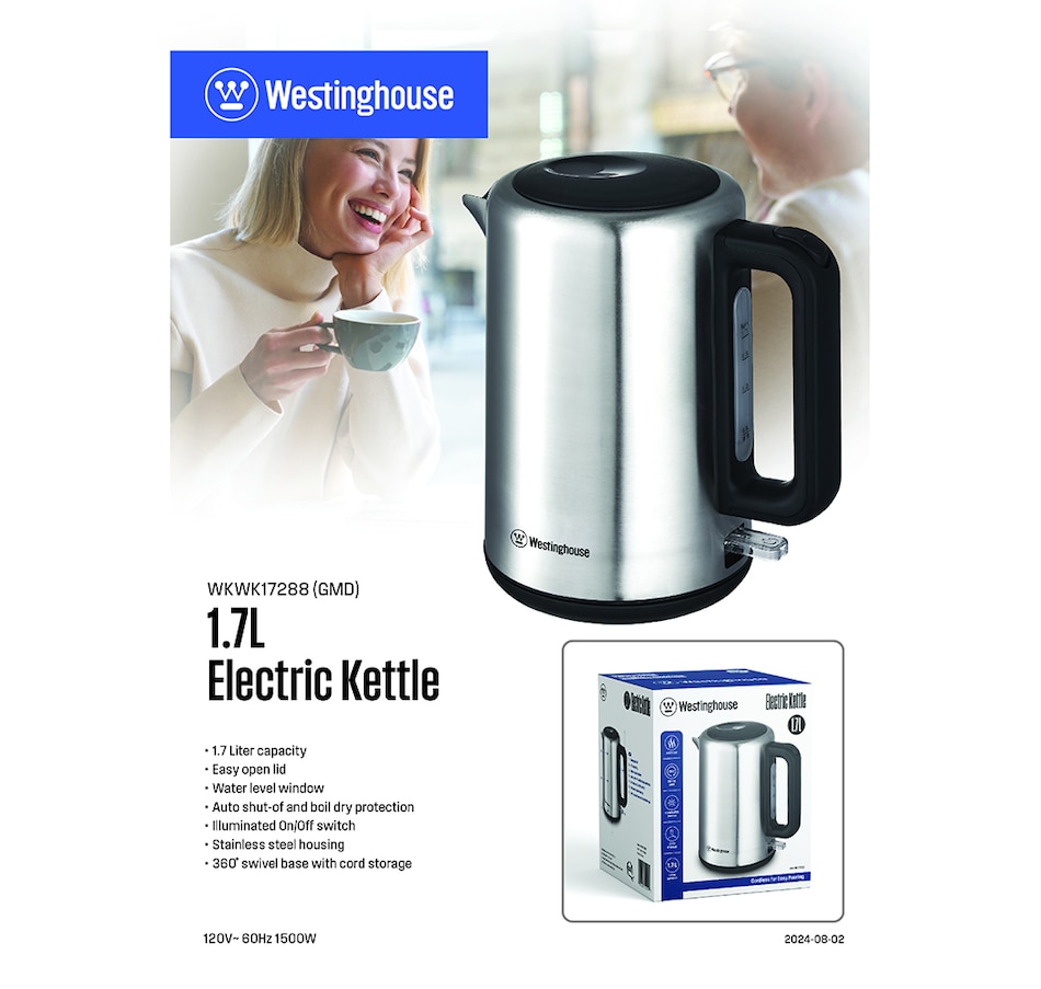 The Westinghouse 1.7L Stainless Steel Electric Kettle is a sleek and efficient addition to your kitchen. Powered by 120V AC with a frequency of 60Hz and a robust 1500-watt capacity, this kettle can ensure rapid boiling for your convenience, and it features an LED power indicator for easy monitoring and automatic switch-off functionality for added safety. With its automatic lid-opening function, water gauge and removable filter, it also offers user-friendly operation and maintenance. Sporting an attractive SUS colour and packaged in a five-layer gift box, the kettle can make an ideal gift option as well.