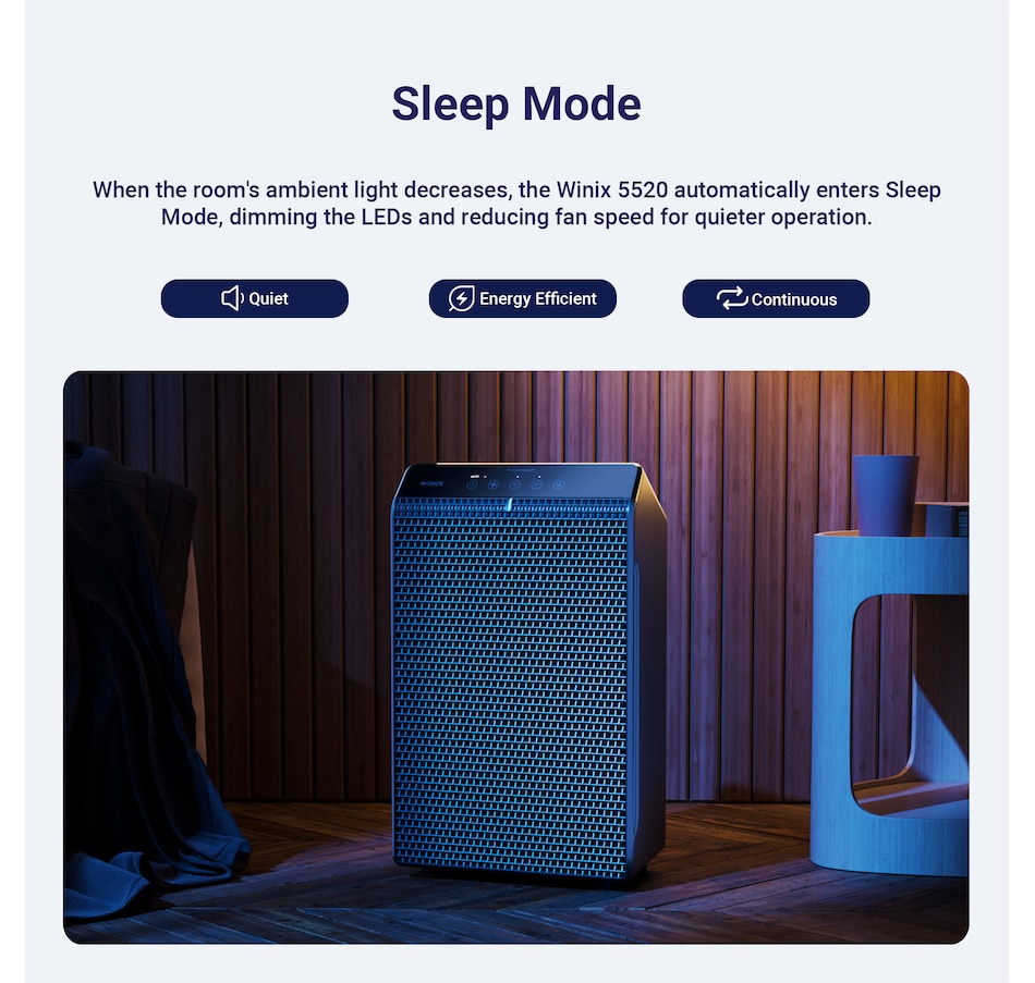 • Unit automatically activates its quiet, energy-efficient Sleep Mode when room is darkened and returns to Auto Mode in the presence of light