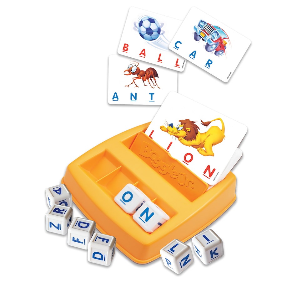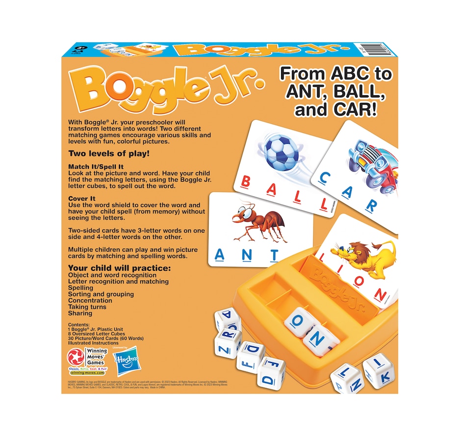 With Boggle Jr. your preschooler will transform letters into words! Two different matching games encourage various skills and levels with fun, colourful pictures. Two-sided cards have three-letter words on one side and four-letter words on the other. In Match It/Spell It ,children look at the picture and word, then they find the matching letters using the Boggle Jr. letter cubes,to spell it out. In Cover It, children use the word shield to cover the word and then spell (from memory) without seeing the letters. Features 2 levels of play, for ages 3 .
