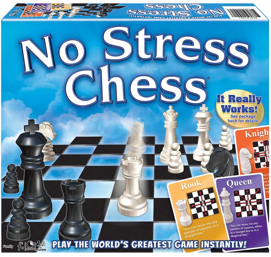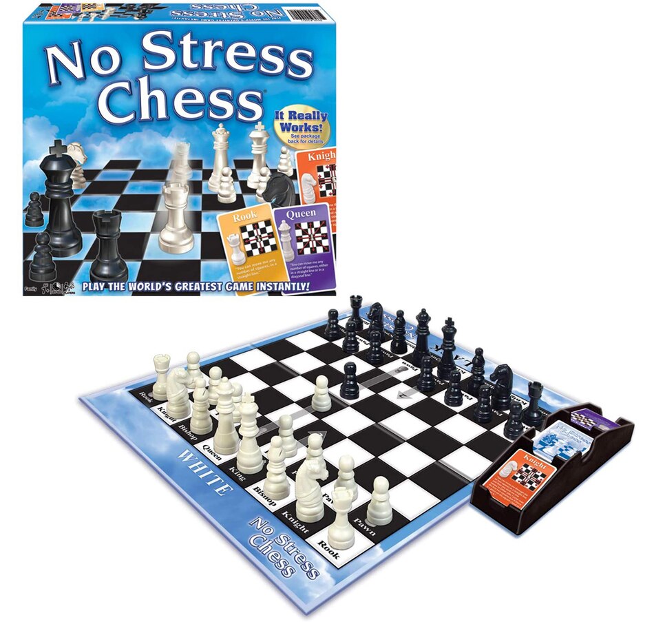 2 Players, Ages 7 The game is played on a regulation Chess board, but doesn’t require the movement knowledge or planning of Standard Chess. No Stress Chess can be played at several levels of difficulty, gradually introducing players to Standard Chess in incremental steps. When you’re ready, just flip the board to its Standard Chess board side and play the authentic 'king of games'.
