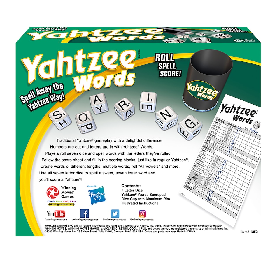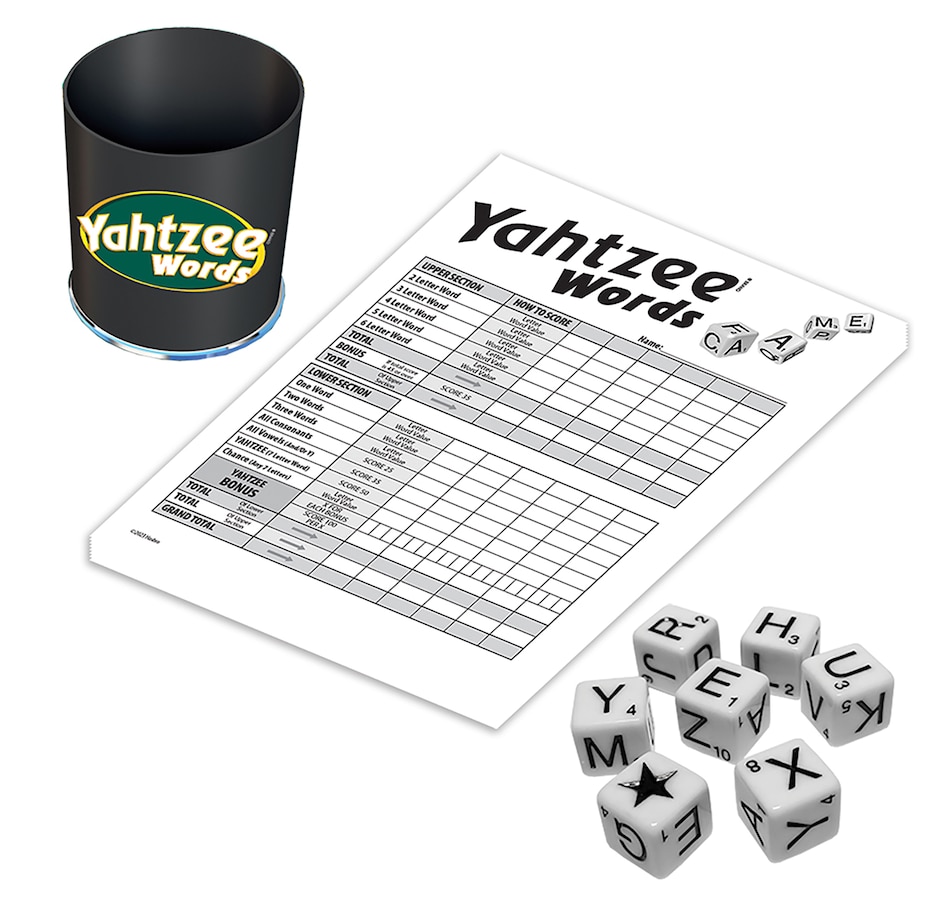 This offers traditional Yahtzee gameplay with a delightful difference: numbers are out and letters are in with Yahtzee Words. Players roll seven dice and spell words with the letters they've rolled. Follow the score sheet and fill in the scoring blocks, just like in regular Yahtzee. Create words of different lengths, multiple words, roll "All Vowels" and more. Use all seven letter dice to spell a sweet, seven letter word and you'll score a Yahtzee! For ages 8 , 2 or more players.