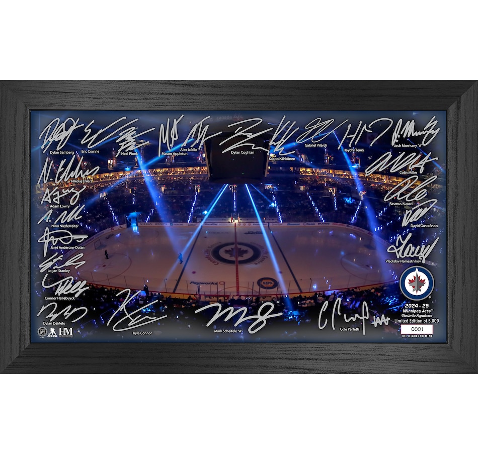 This 2024–25 Season Signature Rink features the facsimile signatures of the Winnipeg Jets roster around their home rink. Each print is individually hand-numbered and delivered in a 12" x 20" wooden frame with an acrylic glass front panel.