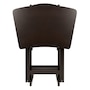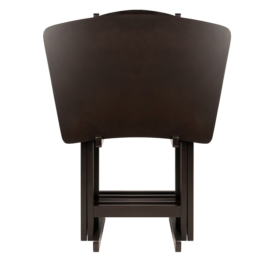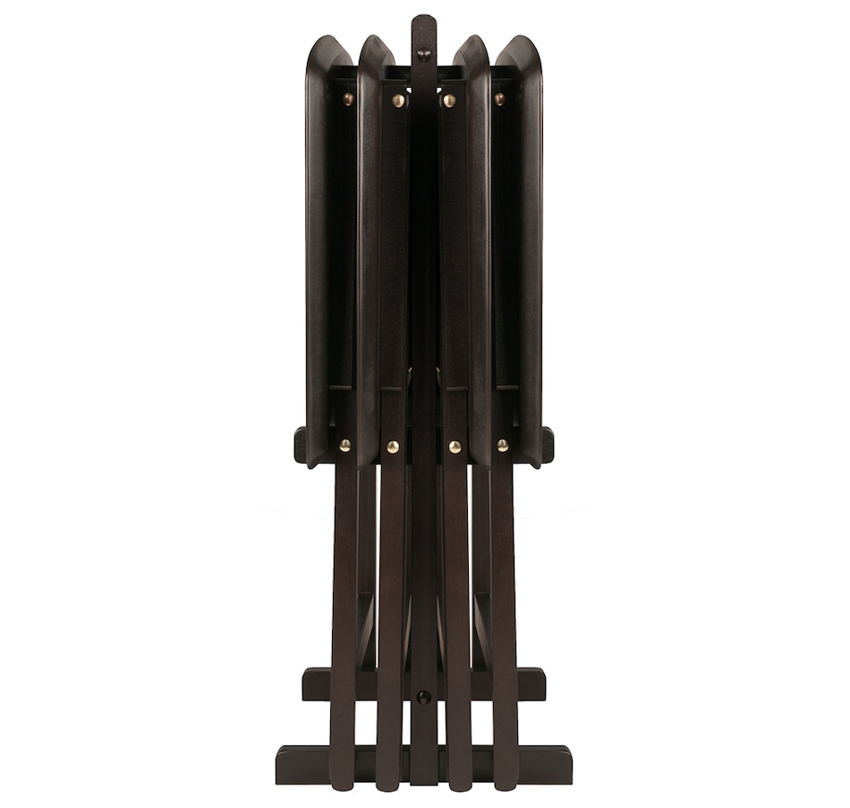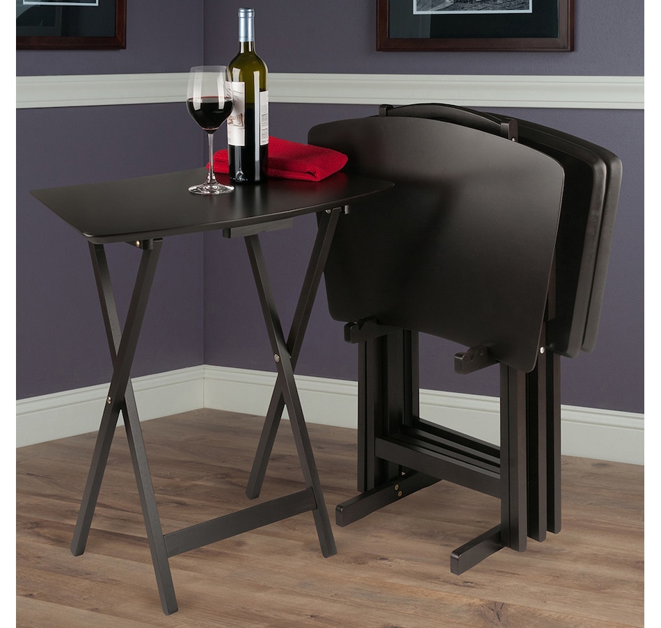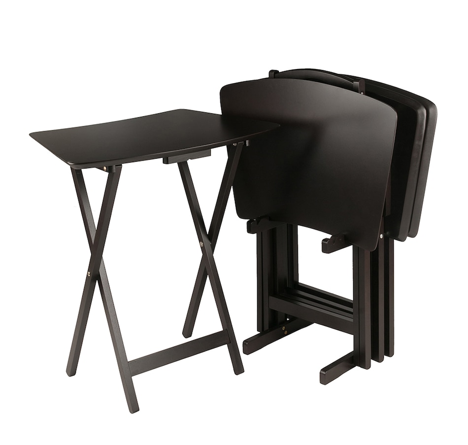 Make entertaining simple and easy with the Winsome wood Anila 5-piece snack table set. It's the perfect companion piece for a casual meal in front of the TV or on the patio. These Anila snack tables bring a distinct and enchanting new look to TV trays! This versatile set includes four folding snack trays with beveled edges that show off the gently curved fan shape, and with the longer arc you get even more tabletop space. They're ideal for entertaining and putting out appetizers, so bring out the set and pull up the tables as you and your guests sit back and enjoy! They're also great for daily use and compact enough to store in the closet. For extra convenience, an upright stand is an innovative addition to this set as it serves as a rack to store the folded tables discretely when not in use. Constructed of solid and composite wood in a deep coffee finish, this set of foldable tables easily open up to X-frame bases, which make these table not only look good but also help with stability. They're all conveniently packed and shipped in 1 box. Tables arrive ready to use and require no assembly; minimal assembly is required for the stand and the hardware that is necessary is included.