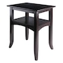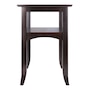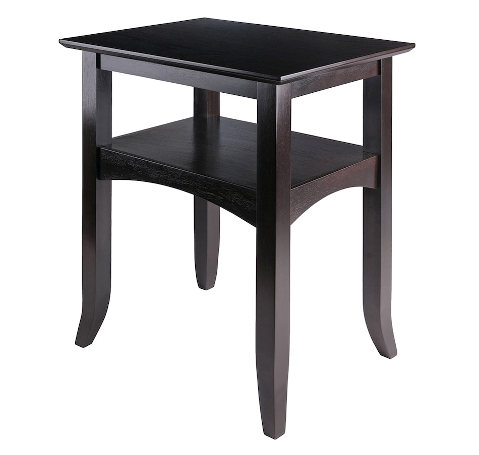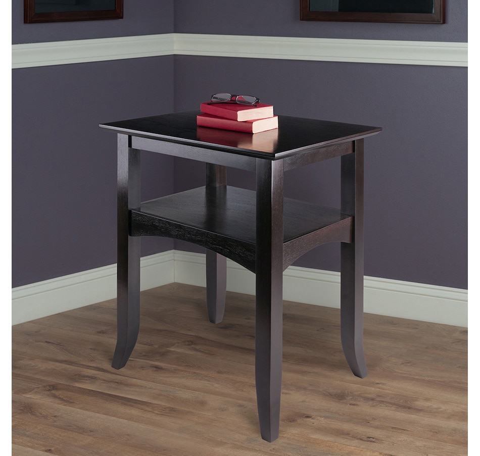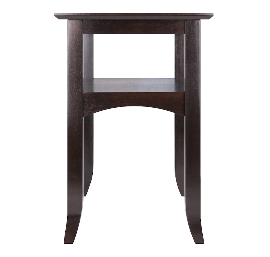 Simplify your family room while adding a touch of elegance and class with the Winsome Wood Camden end table. This collection is uniquely defined by its style of slightly flared legs and curved aprons bordering the lower shelf, offering an attractive and functional space for your daily needs. Use it in the living room or bedroom to show off a table lamp or framed photos, and have plenty of room on the shelf below for remotes, personal electronic devices, books and/or magazines. The rectangular shape allows for positioning that easily suits your furniture arrangement and room dimensions. For larger sofas and rooms, try adding one accent table on each side. The natural wood grain brings out the warmth and elegance of the rich coffee finish. It is made up of remarkably sturdy solid wood for long lasting durability, and you can coordinate this console table with other furnishings from the Winsome Camden collection for a cohesive look throughout your home. Conveniently packed and shipped in one box, that includes the hardware necessary for assembling.