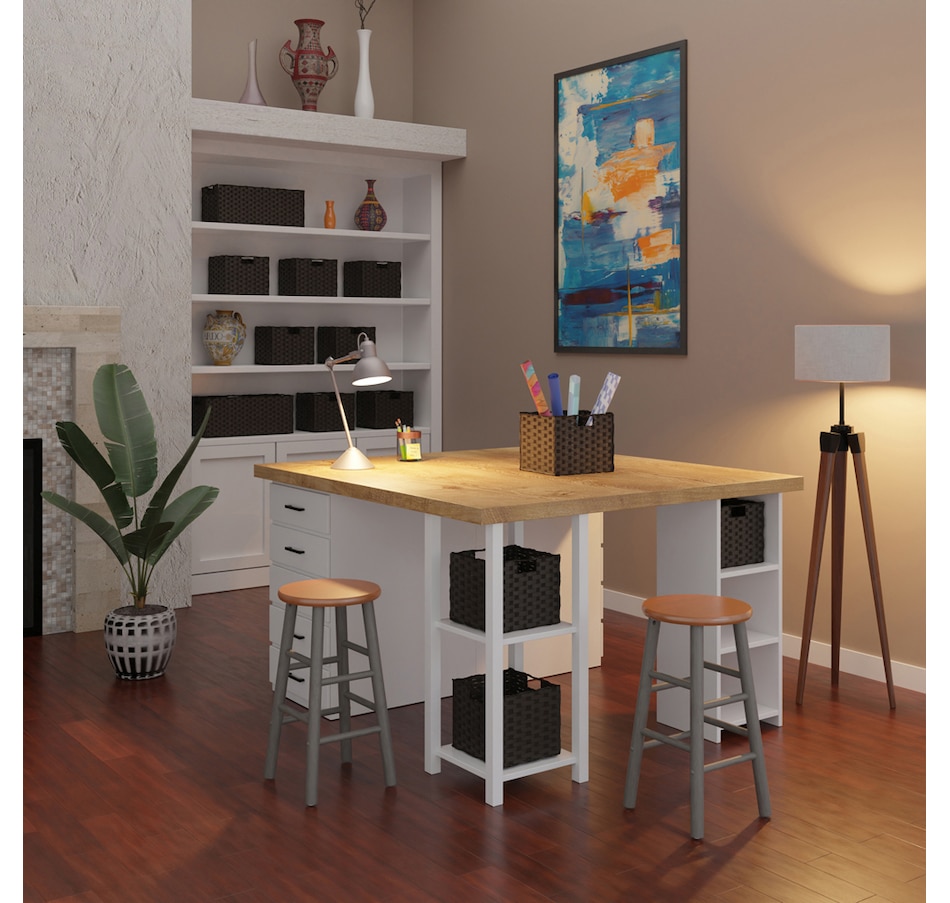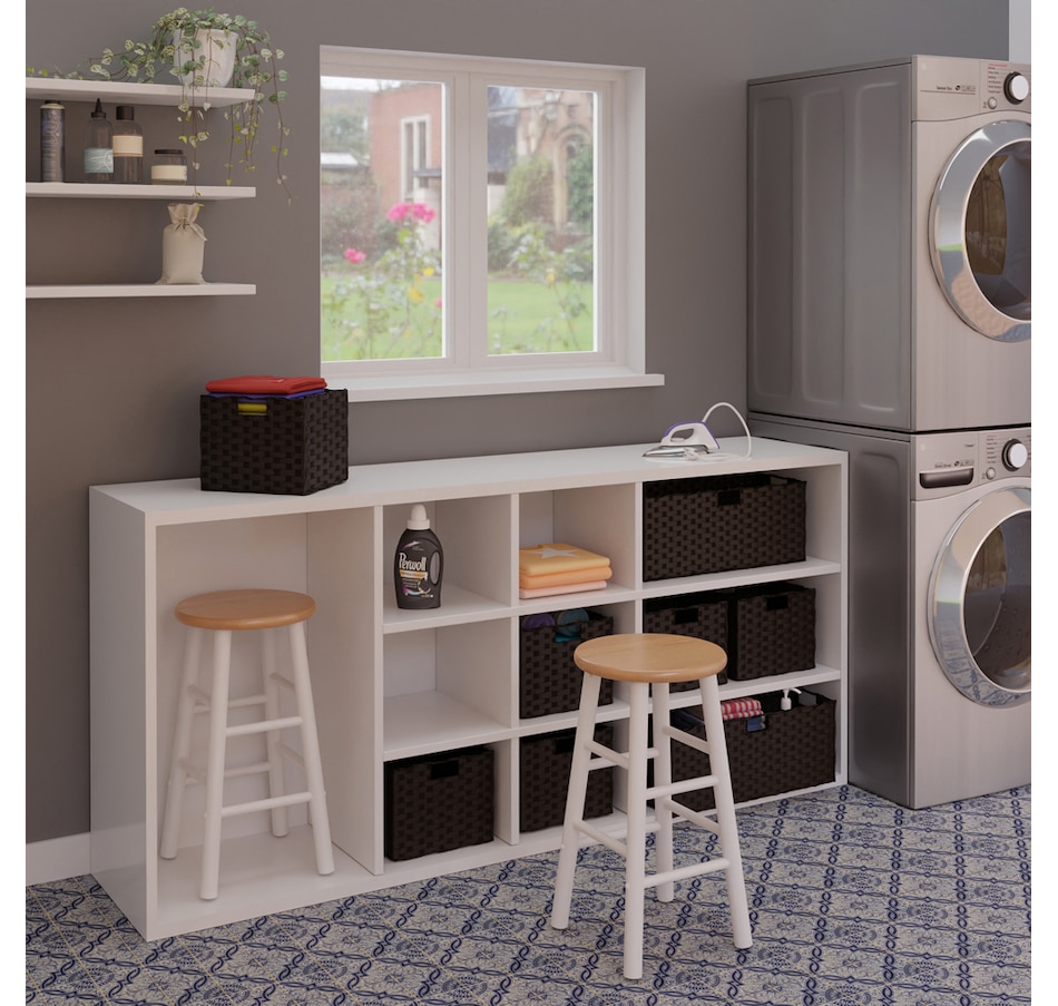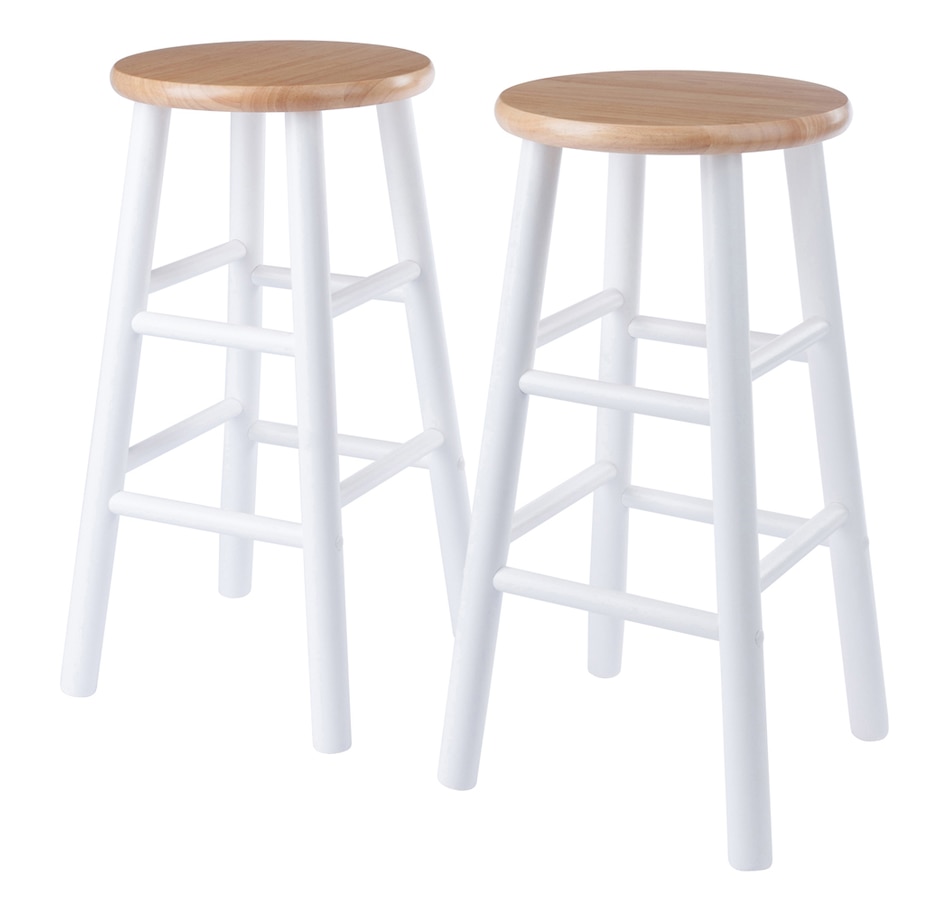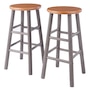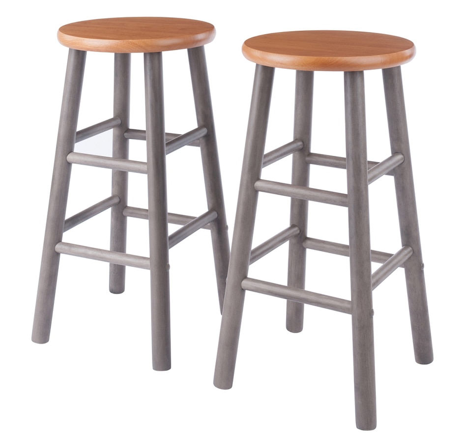 The Winsome Wood 2-piece Huxton Counter Stools will be your go-to seating in the kitchen, family room or dining area. They feature a more conservative foot print than many other flared-leg stools which give them a streamlined, contemporary look and allow them to be tucked neatly underneath a counter or table. Crafted of solid wood, the charming combination of a Teak-finished seat and gray base are a perfect fit with any décor from farmhouse to transitional to modern. Both high and low crossbars on all sides provide stability while also serving as convenient footrests. The round seat provides a generous seating area or an attractive stand for your favorite lamp or plant. The stools are also available in a taller bar height.