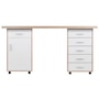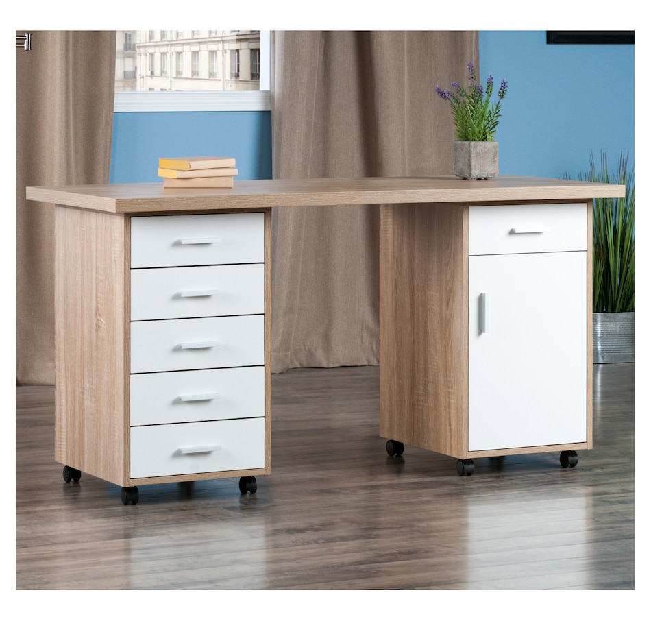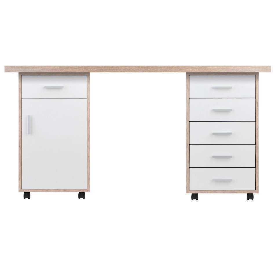 This three-piece modular desk group offers a simple and unique way to create a desk and storage unit that works for you. The tabletop fits securely and neatly over the two side cabinets, one with a drawer and a large cabinet, and the other with five drawers. These cabinets also come with professional-grade casters so you can move the finished piece easily. The top and cabinet frames are made of durable composite wood in a finish that has all the appearance of natural reclaimed wood. The cabinet and drawer facings are finished in linen white with modern matte-silver plastic drawer and door pulls.