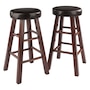 Linger over dinner or work at your home desk in total comfort with the Maria 2-PC Counter Stool Set. The stools provide maximum comfort for your seating. The frame is made of solid wood in a rich walnut finish that complements the espresso faux leather, a subtle and handsome combination that will suit any decor from modern to rustic cottage. The construction boasts squared legs with eight crossbars which give stability and strength while also serving as convenient footrests. Use the set at a counter height table, for extra seating when guests arrive, or at work in your home office.