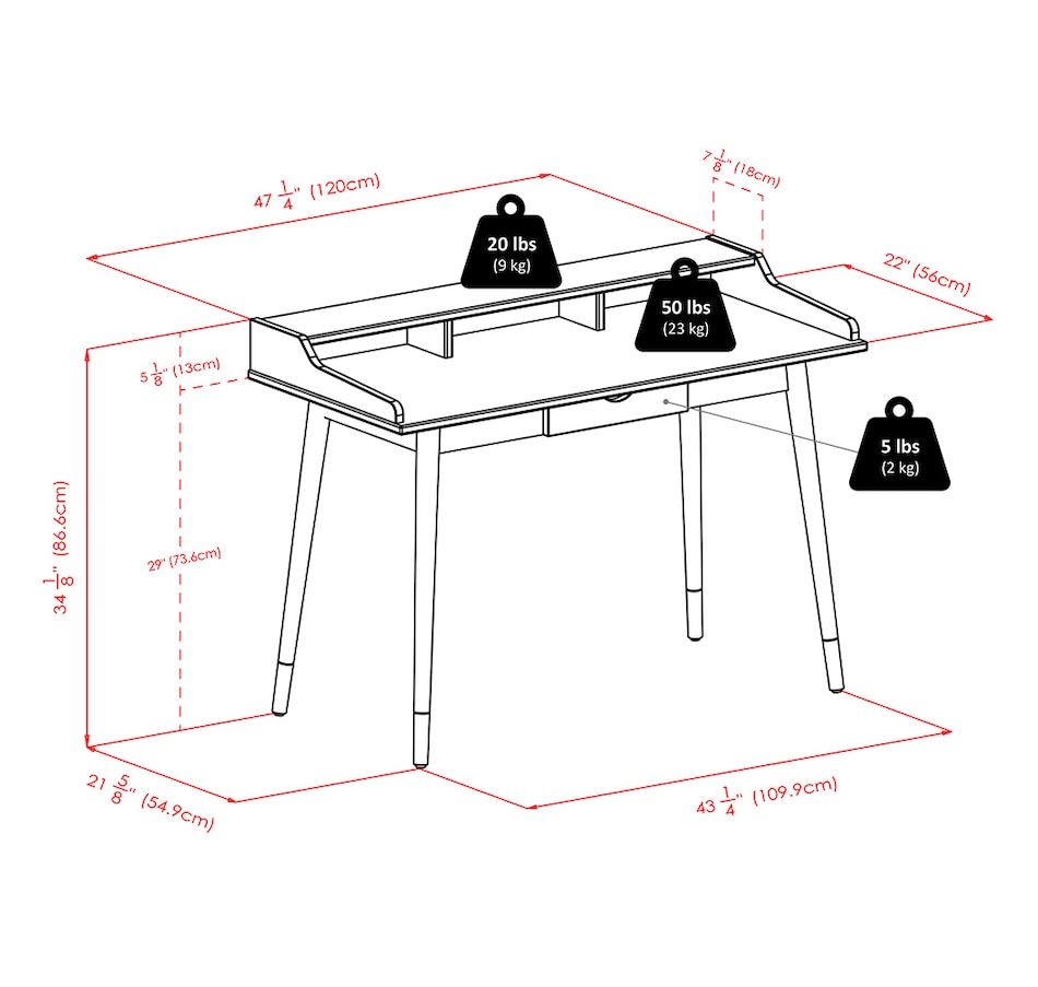 • Static weight capacity: desktop: 50 lbs.; hutch: 20 lbs.; drawer: 5 lbs.