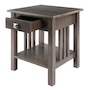 A handsome blend of classic and contemporary styling enables the Winsome wood Stafford end table to complement any decor. The mission-like slatted side panels create an open feel while the oyster gray finish gives it a modern touch. It features one drawer, making it just right by your bedside for a reading lamp, storing small personal accessories out of sight, and yet within easy reach for your convenience. The drawer is tastefully accented with a beveled silver-finish pull. An open lower shelf is ideal for keeping books and magazines. Use this all-around end table in the living room next to the sofa or as a printer stand in your home office. For larger beds, sofas or rooms, try adding one accent table on each end and coordinate with other furnishings from the Winsome Stafford collection for a cohesive look throughout your home (each sold separately). It features solid and composite wood construction for long-lasting beauty and durability. Conveniently packed and shipped in 1 box that includes the hardware necessary for assembling.