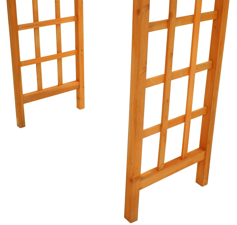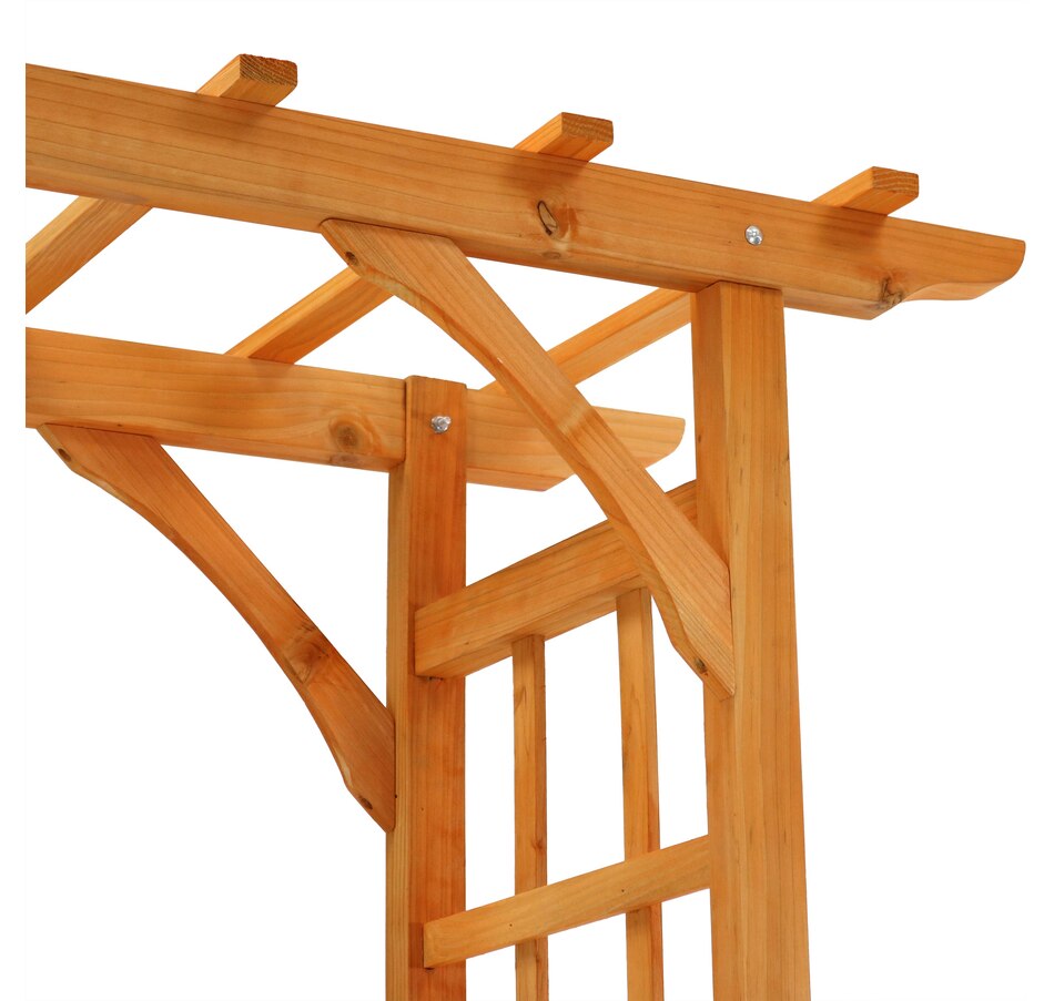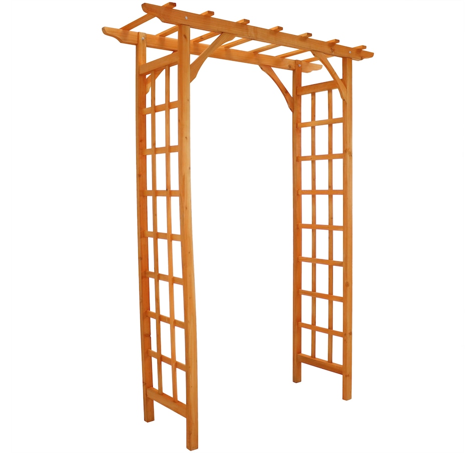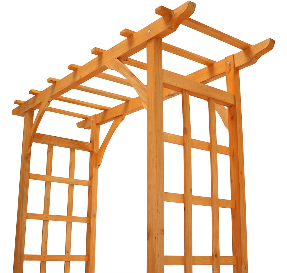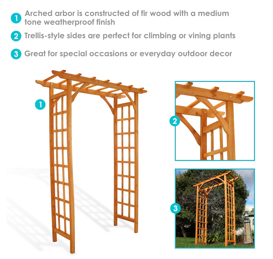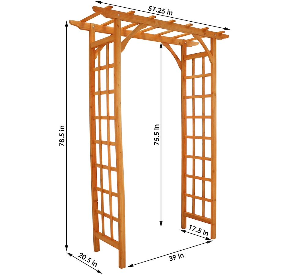 This wooden garden arbor adds structure and charm to outdoor landscapes, creating an inviting entryway for pathways, weddings, and gatherings. Measuring 57.25" wide by 20.5" deep and 78.5" high, with interior clearance of 39" W x 17.5" D x 75.5" H, it provides ample space for guests or garden strolls. Crafted from durable fir wood with a rich, natural finish, this arbor offers weather-resistant strength while maintaining a warm, organic look. It is recommended to anchor the base into the ground for added stability (hardware not included). The integrated trellis design and side lattice panels offer strong support for climbing plants such as roses, clematis, or ivy, expanding vertical garden space while blending form and function. With its clean lines and classic shape, this arbor serves as a graceful focal point in garden settings, enhancing walkways, flower beds, or event spaces with understated elegance.