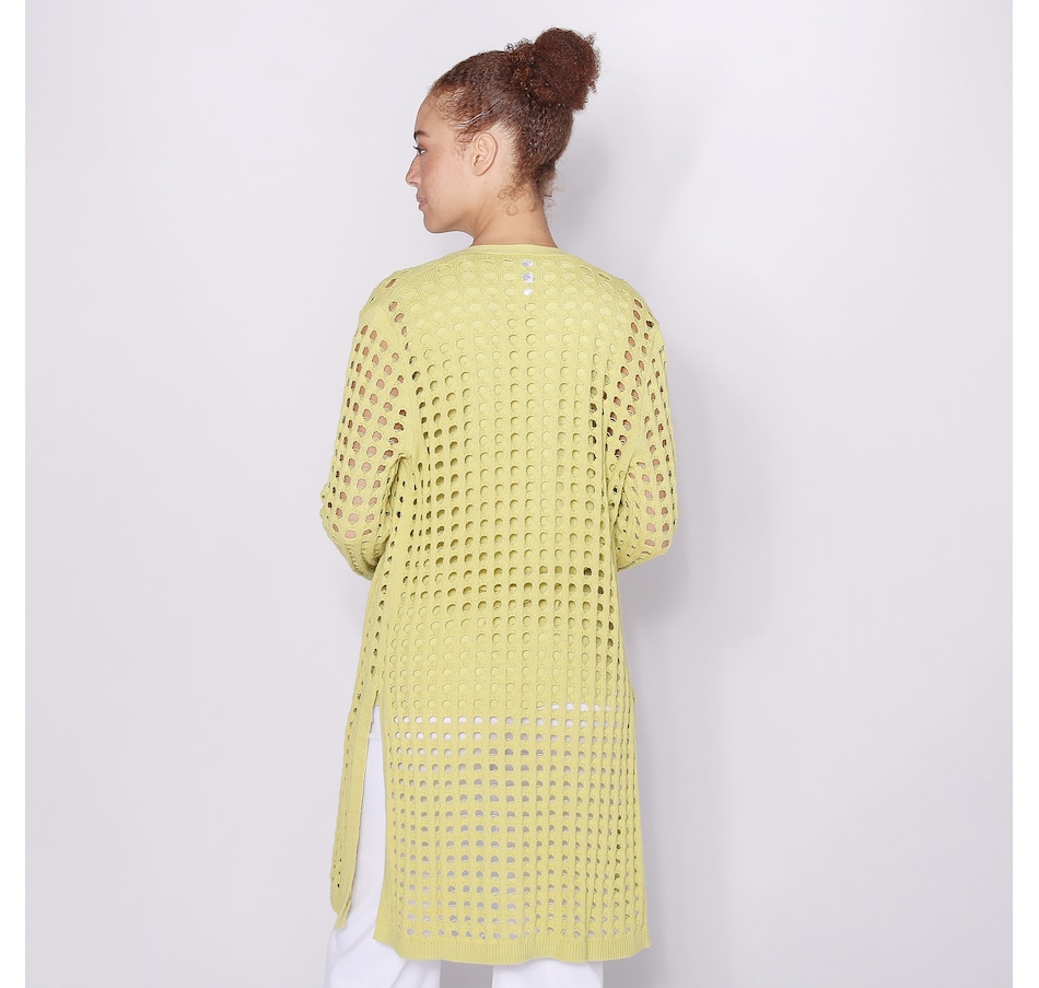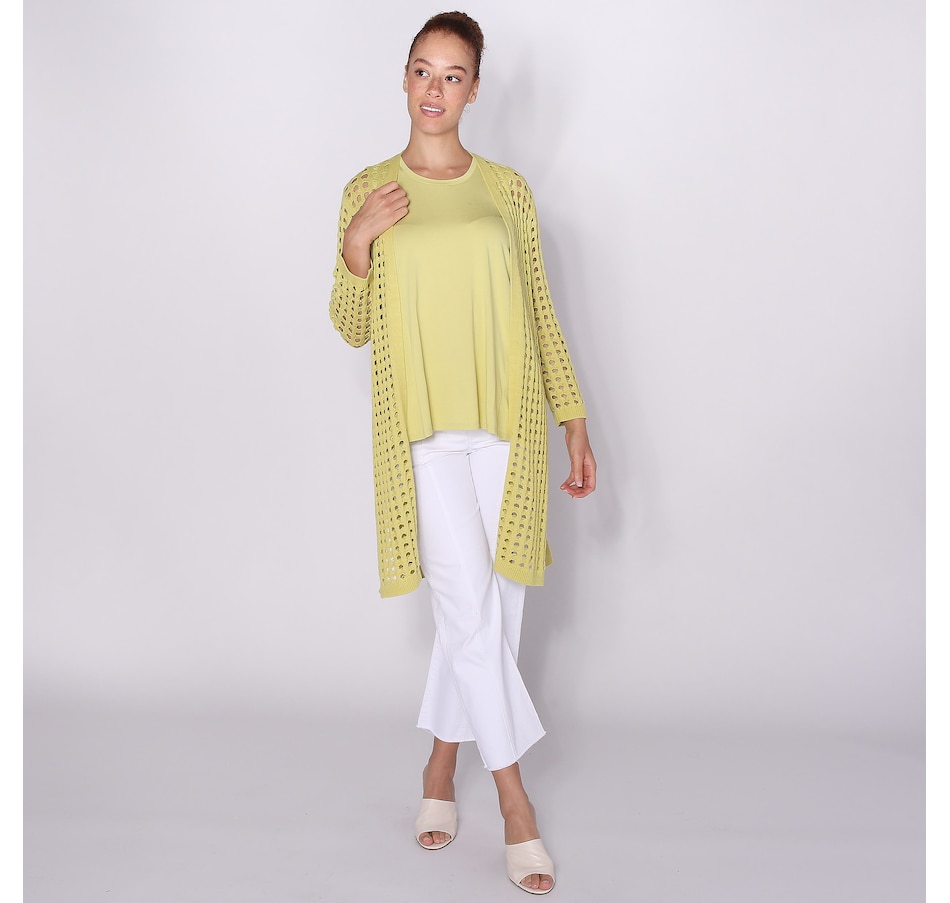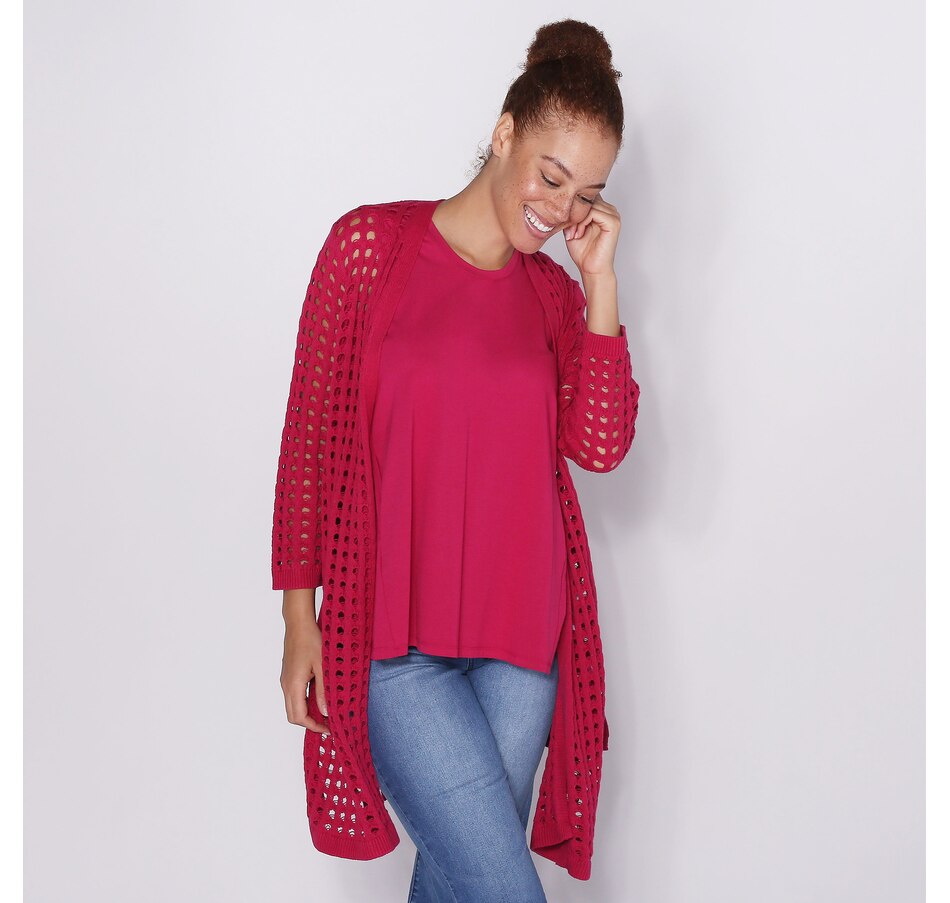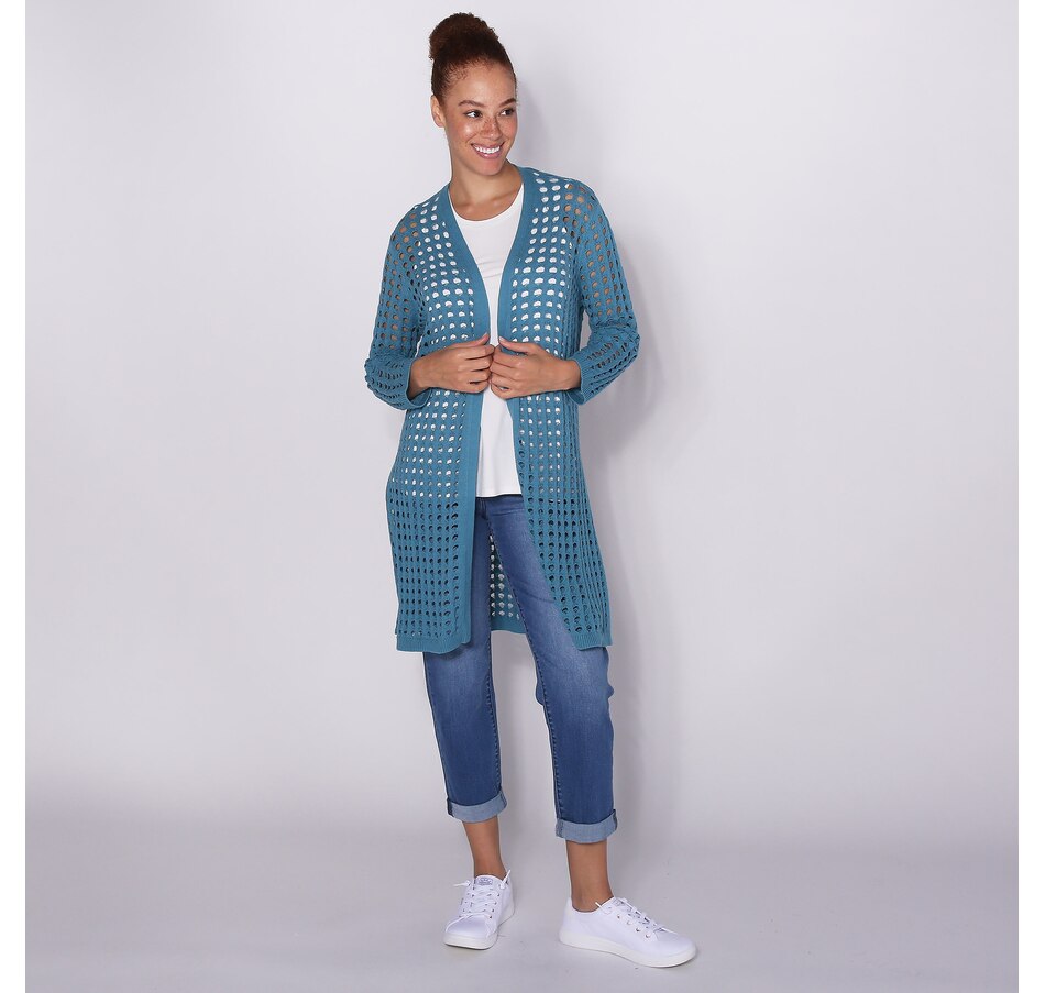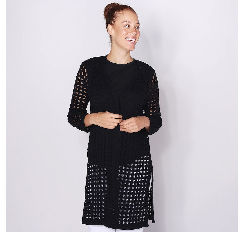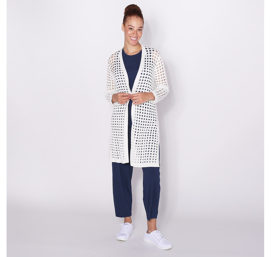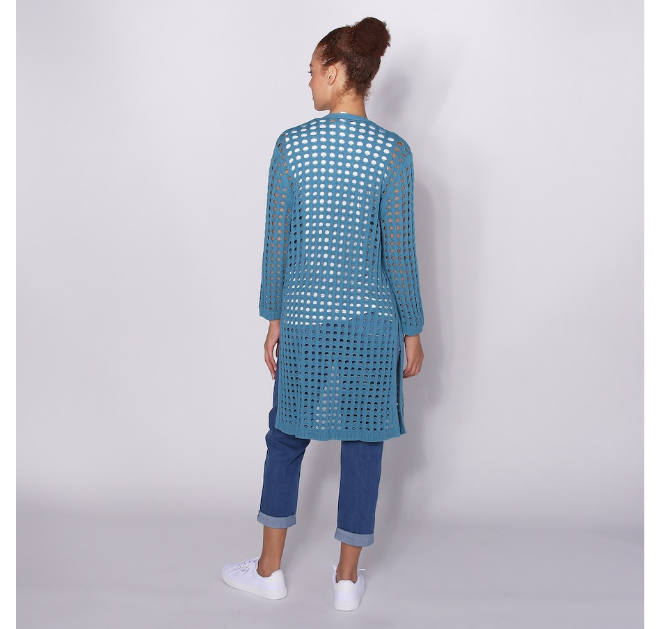 Finish all your ensembles in comfortable, versatile style with this beautiful holey stitch duster from Marla Wynne.