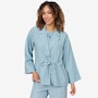 • Loose fit, long sleeve, collared button front with adjustable drawstring