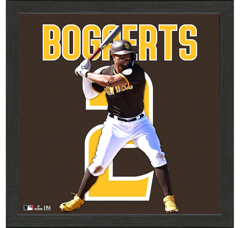 This unique collectible frame features an action image of San Diego Padres star Xander Bogaerts imposed on his respective player number with his name listed just like on his jersey. This printed art is delivered in a 13" x 13" wood frame under glass and ready to hang. This product is officially licensed by the MLB and MLBPA, and proudly made in the USA by The Highland Mint!