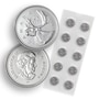 This set includes 10 carefully selected premium gem numismatic uncirculated examples of the 2003 WP mint mark new effigy 25-cent coins. The coins remain sealed in the Royal Canadian Mint's pliofilm packaging and are displayed in a mylar display page.