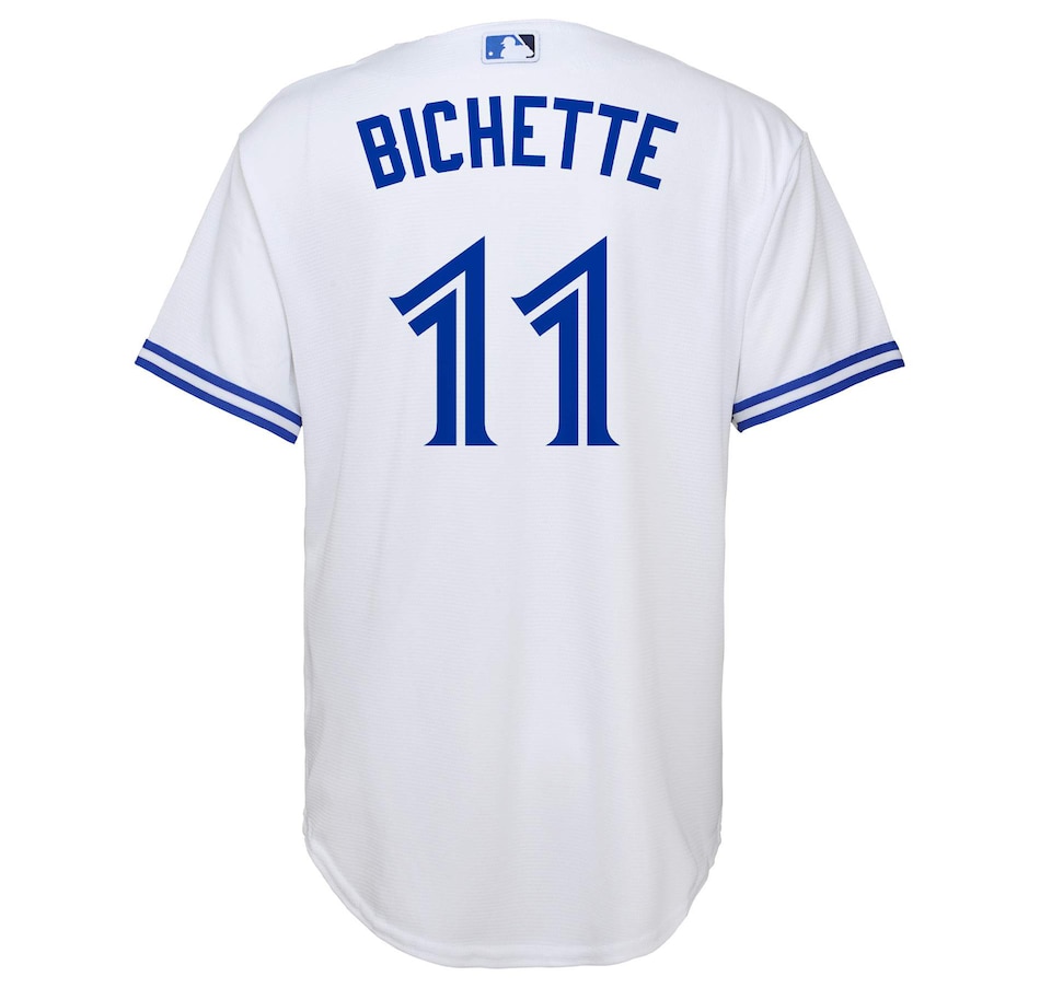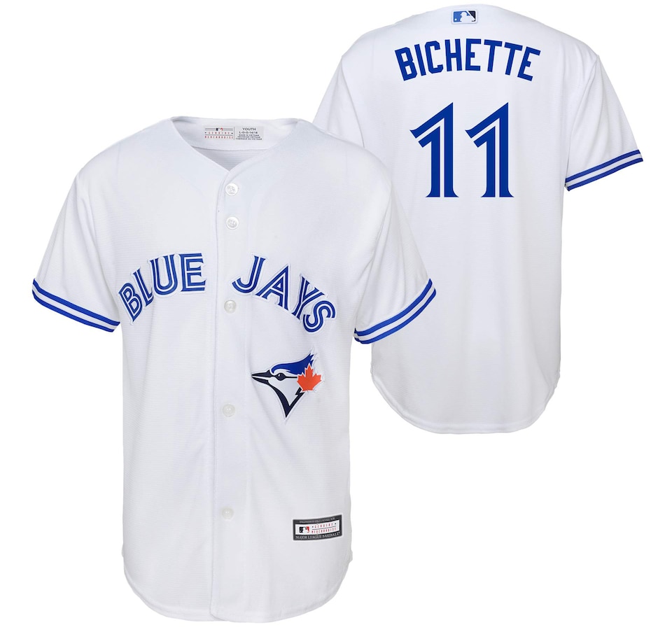 Let your young Blue Jays fan show off their team pride with this officially licensed MLB Bichette home white limited jersey! Made from 100% durable polyester, this jersey features tackle twill team graphics for a bold, standout look. The button closure makes for a comfortable fit, and the MLB genuine product tag on the bottom left hem adds authenticity.