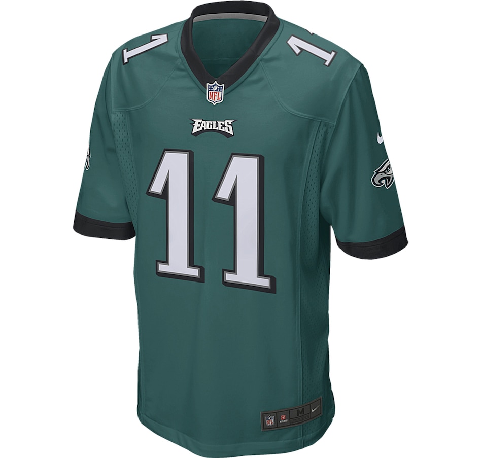 The Nike Game Team Jersey is a Youth NFL player Jersey featuring team name, numbers and logos in screen print, NFL shield logo at collar, satin twill woven jock tag on bottom left hem, nike logo branding on sleeve, on-field apparel - engineered to the exact specifications of the national football league, v-neck, mesh side panels for extra breathability, tagless neck label.