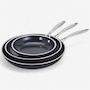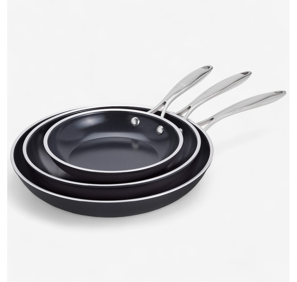 • Stay-cool ergonomic stainless-steel handles are double-riveted to pans