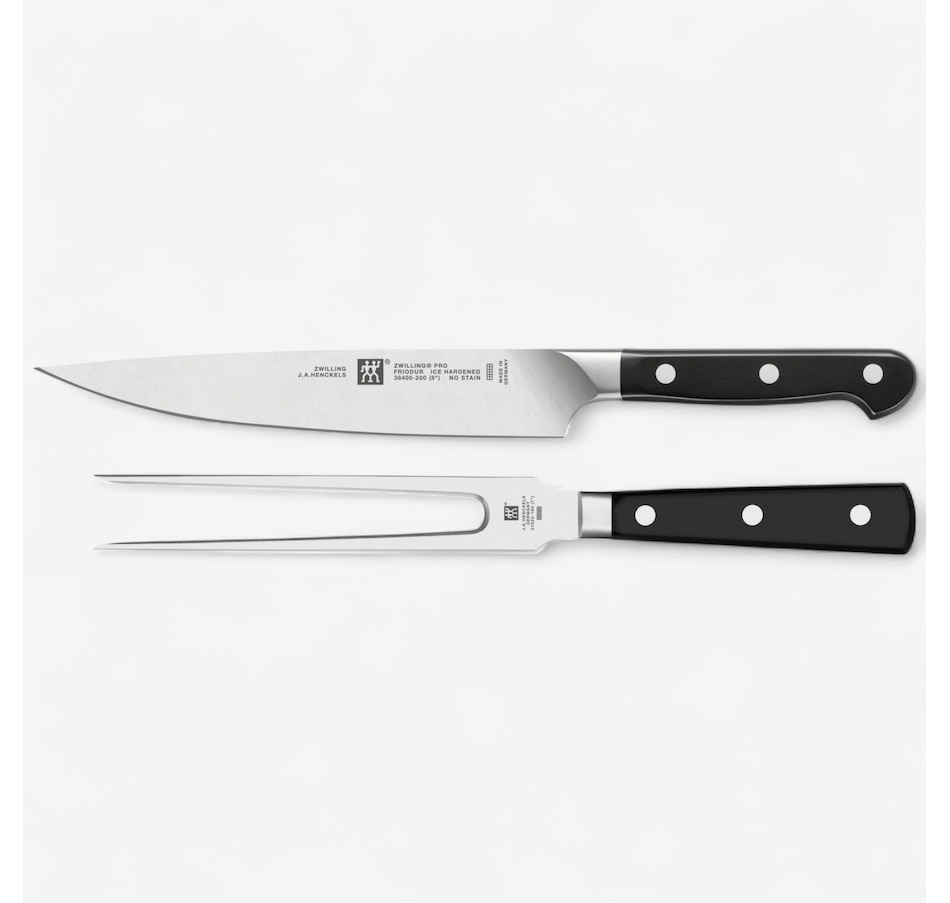 Slice ingredients like a pro with this knife and fork set from Zwilling! Zwilling Pro knives are user-friendly, with unique blade shapes and ergonomic bolsters that are the result of over 285 years of experience in knife-making and the rigorous study of how knives are used. A unique curved bolster supports the professional pinch grip, with thumb and index finger on the blade for safe cutting and less fatigue, and the full length of the blade can be used when cutting and can be sharpened from bolster to tip.