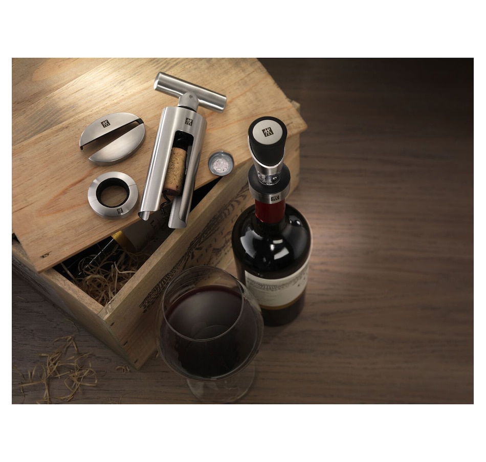 • Elegant set consisting of foil cutter, corkscrew, decanter and drop ring