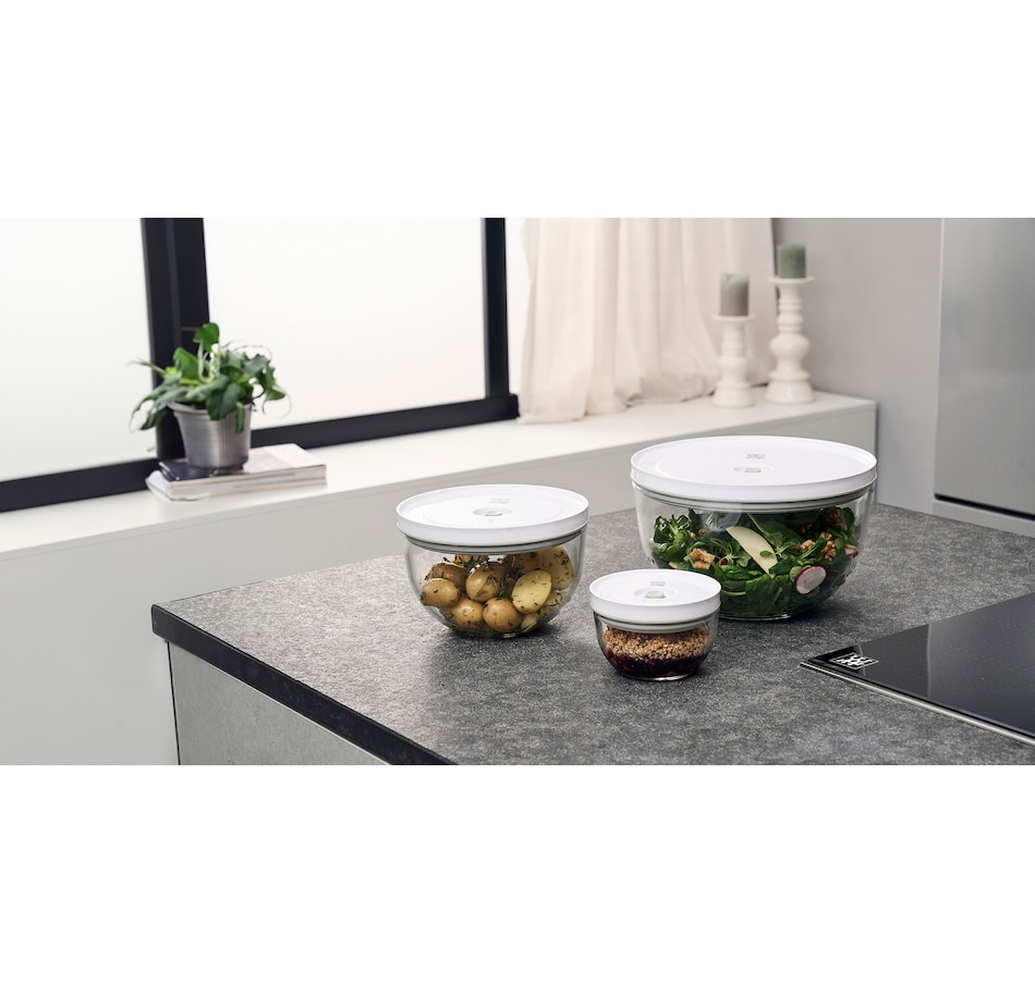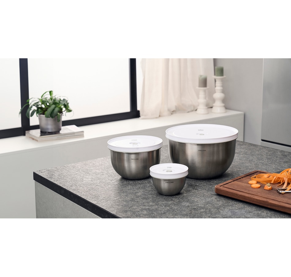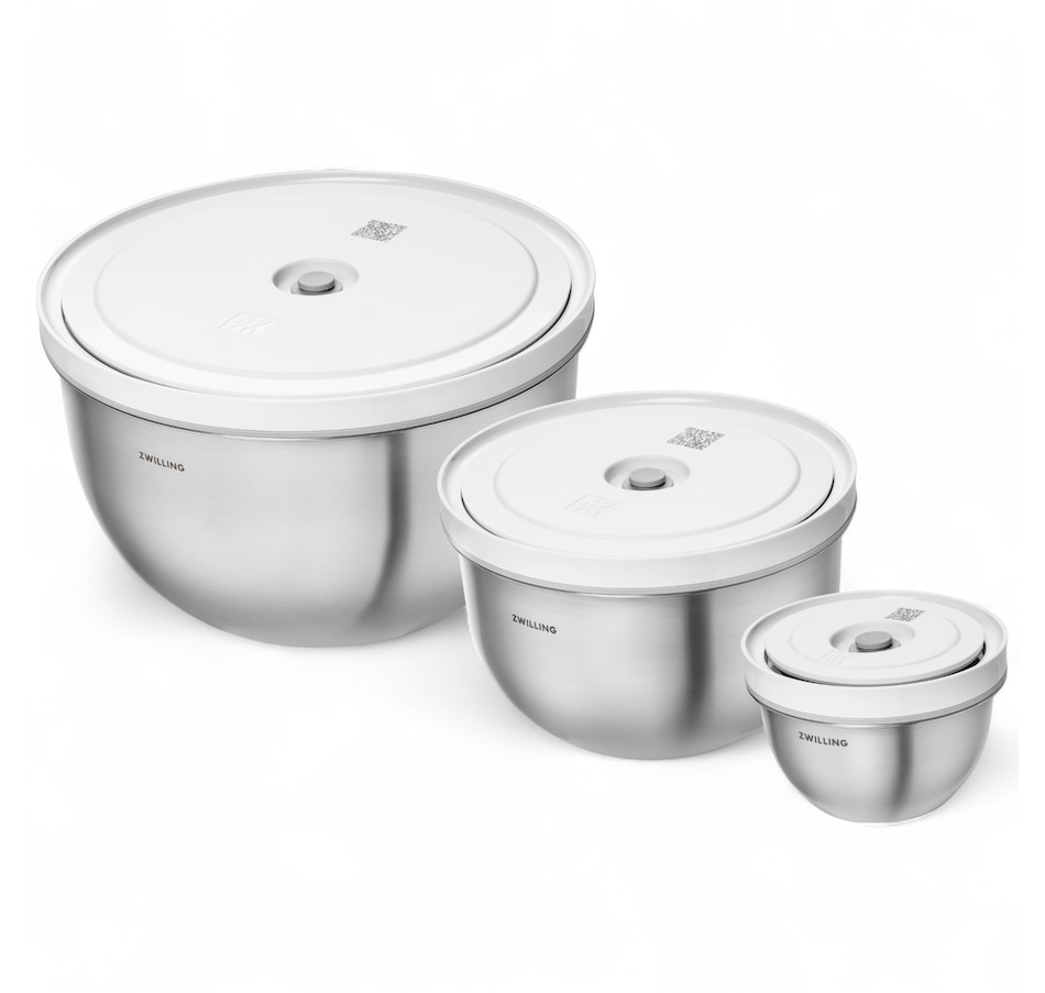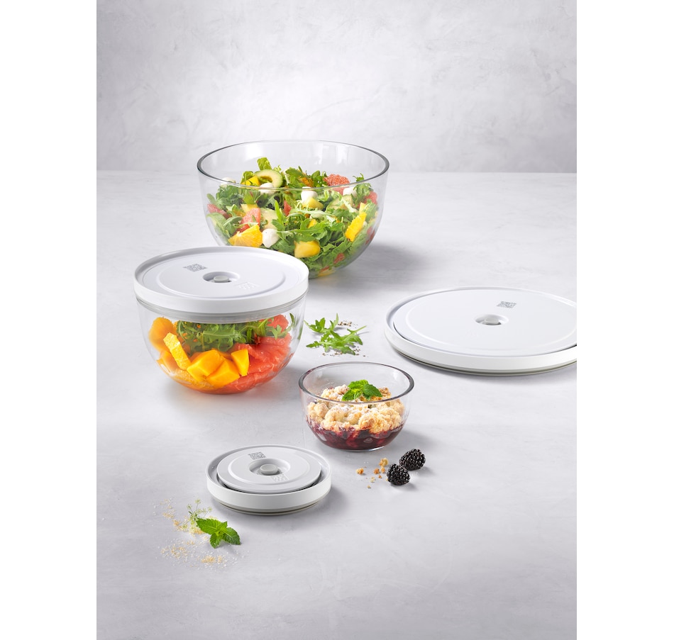 The Zwilling vacuum bowl set is ideal for helping with prepping, serving and storing. Fresh food can stay fresh up to five times longer, it helps to preserve flavour and nutrients, and reduces food waste too!