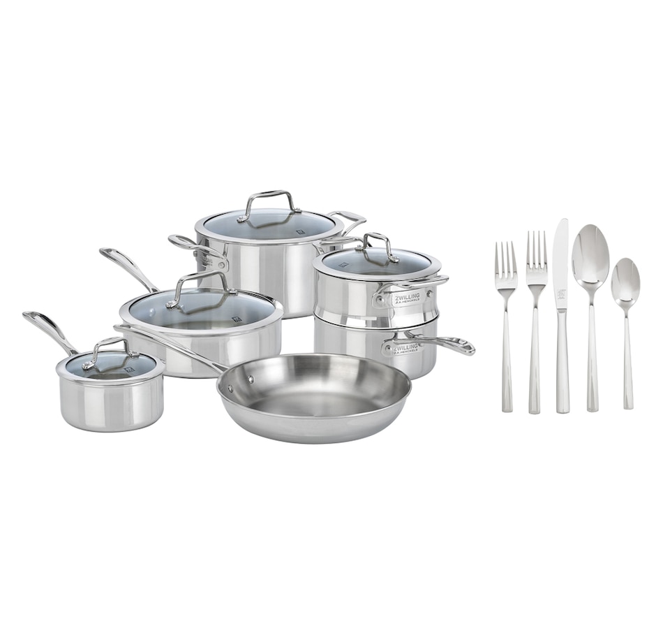 • Zwilling Vista Clad 10-Piece Cookware Set with Bonus 20-Piece Flatware Set