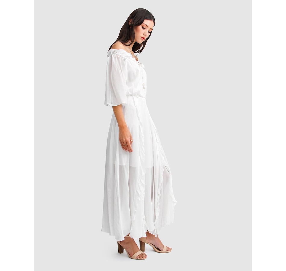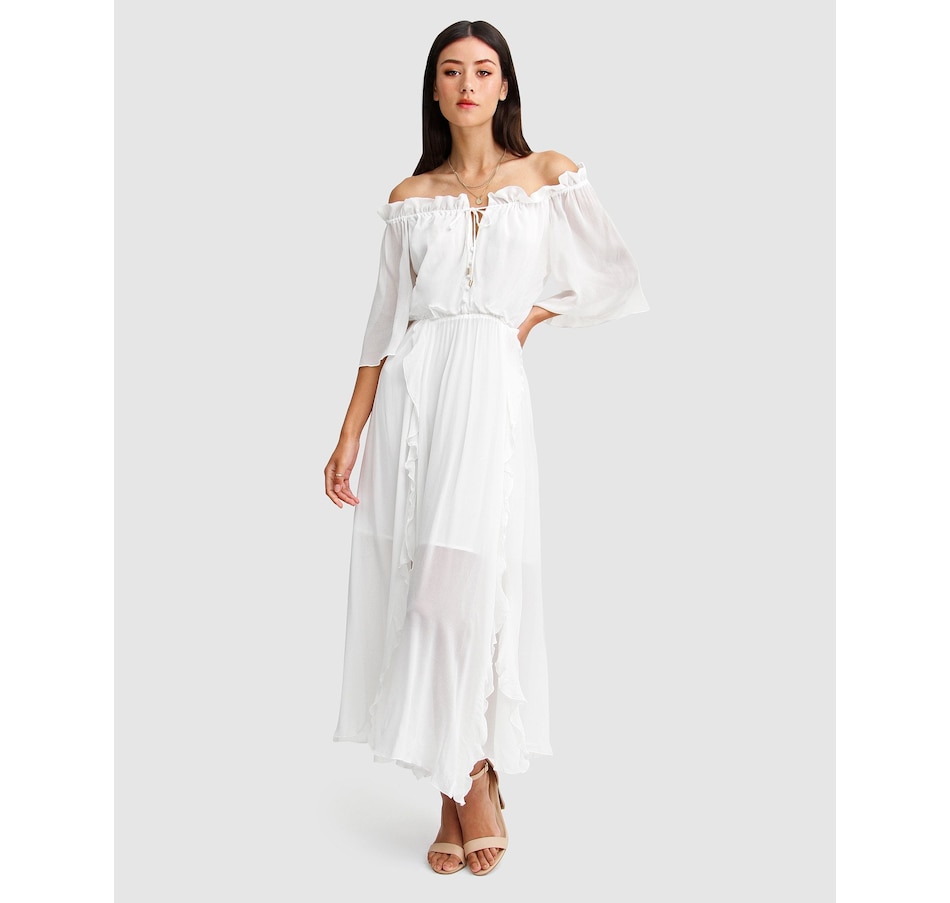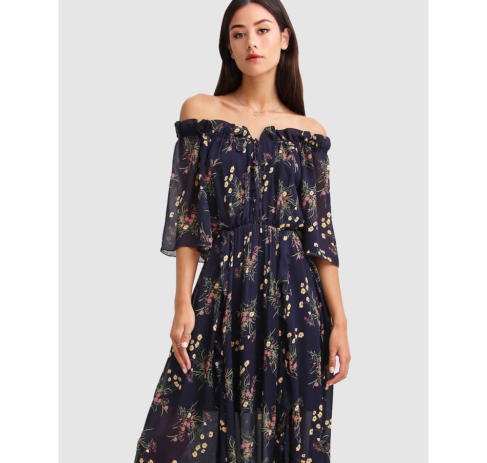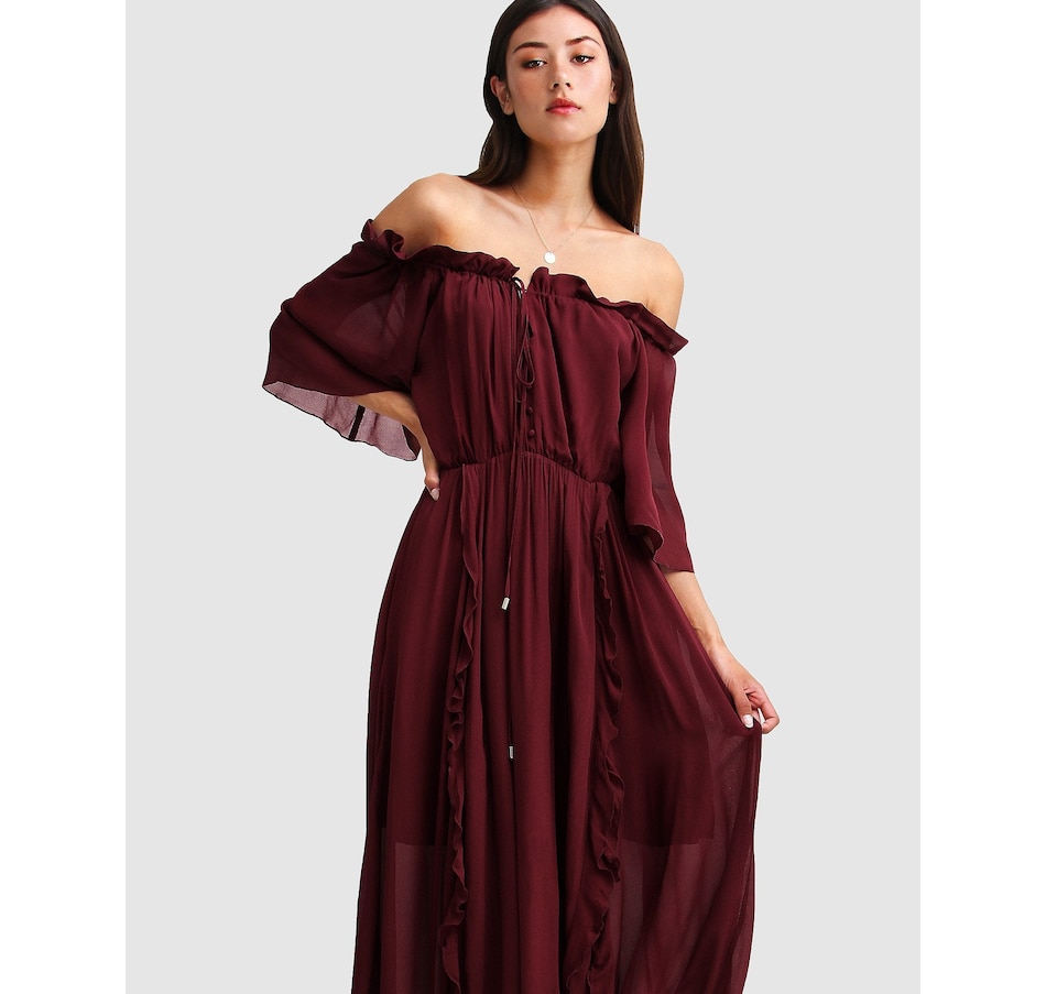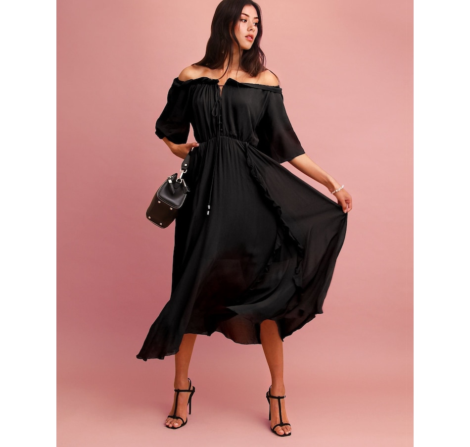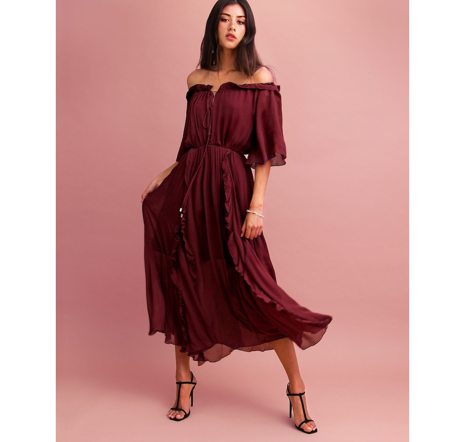 The Amour Amour Ruffled Midi Dress is an ultra boho dress, wear it on or off the shoulder. Pair it with sandals for the beach, or glam it up with heels and statement earrings for the evening.