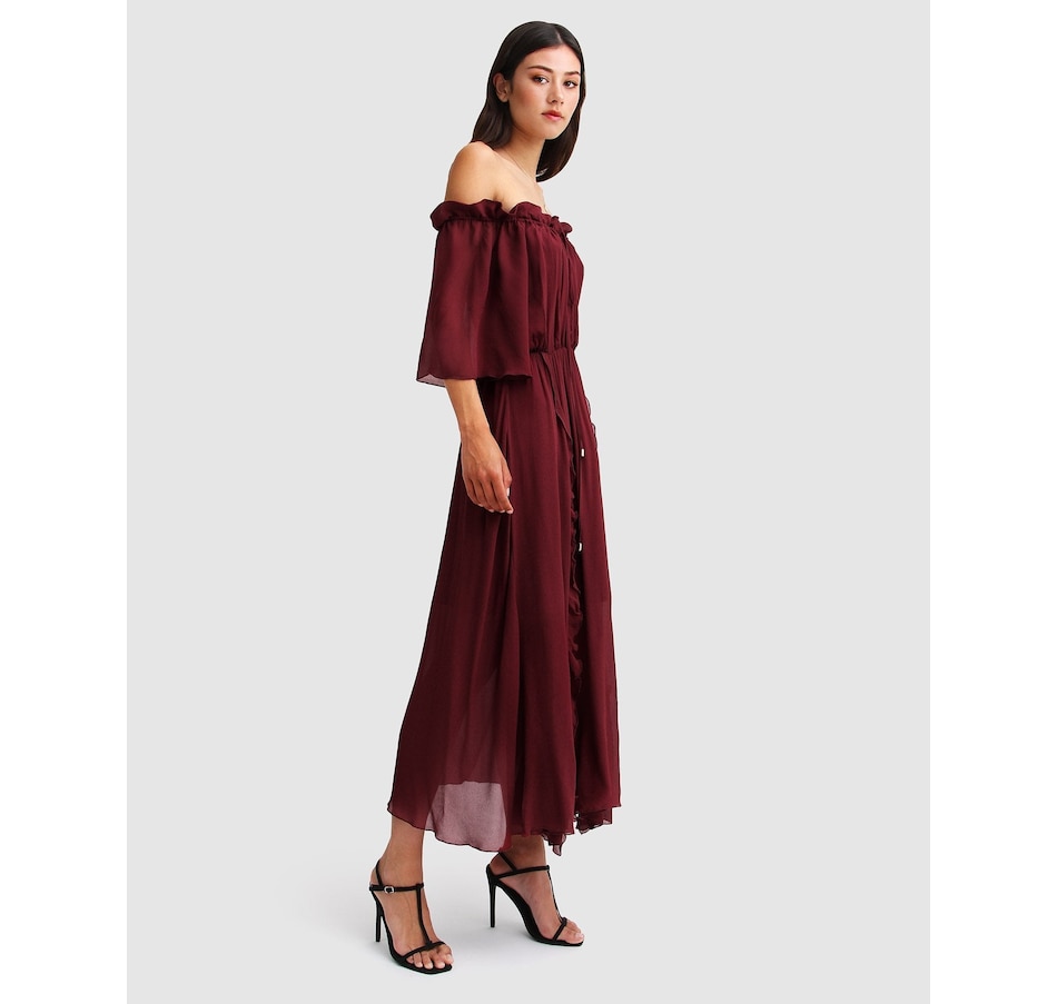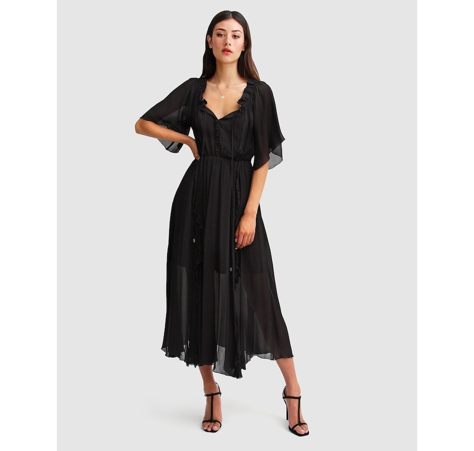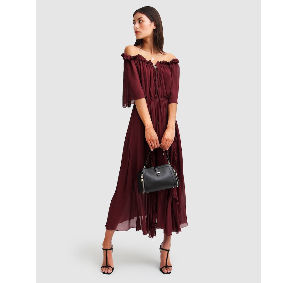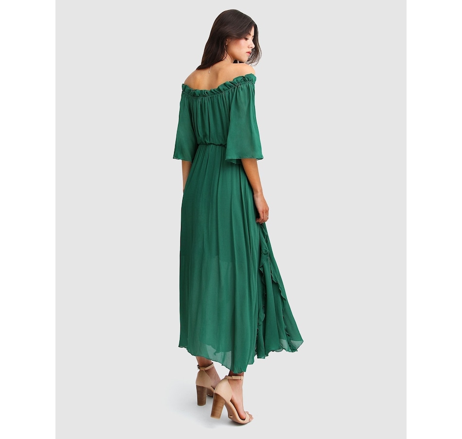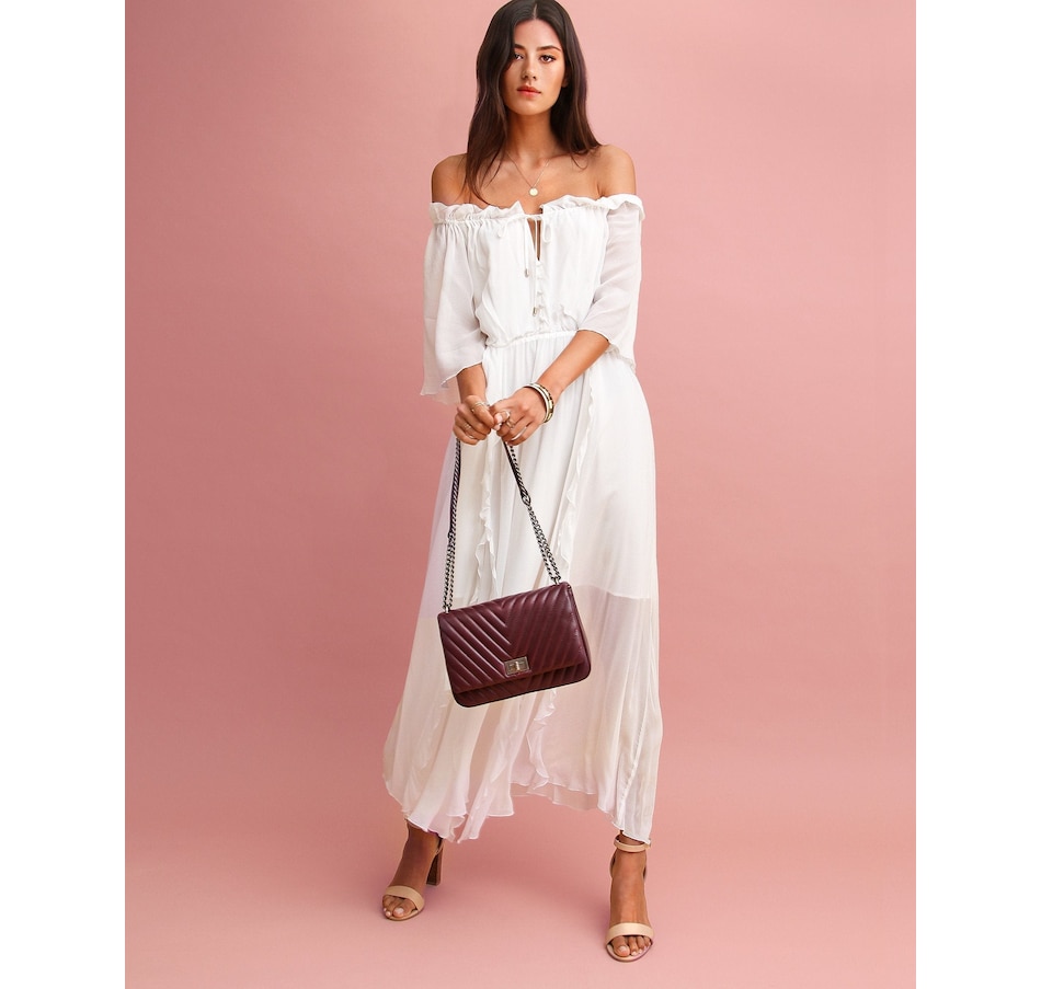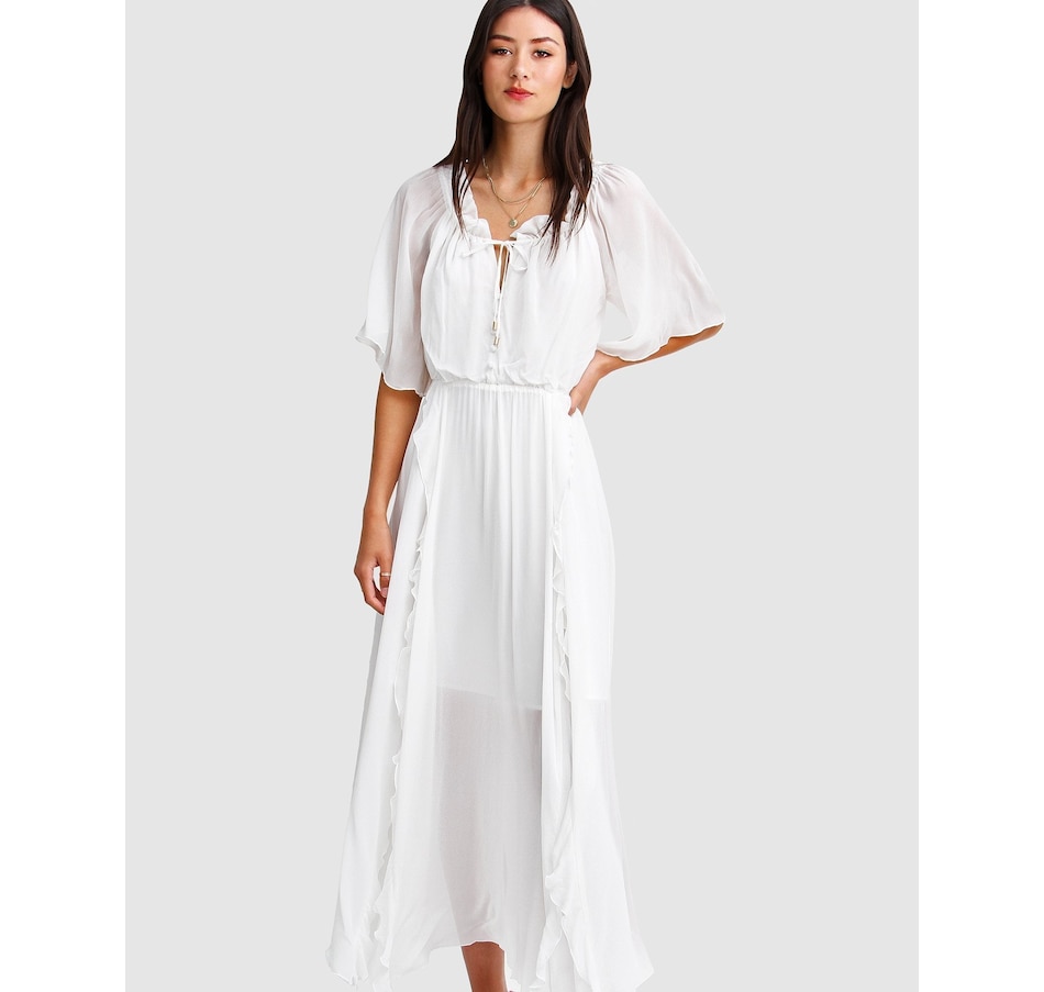 The Amour Amour Ruffled Midi Dress is an ultra boho dress, wear it on or off the shoulder. Pair it with sandals for the beach, or glam it up with heels and statement earrings for the evening.