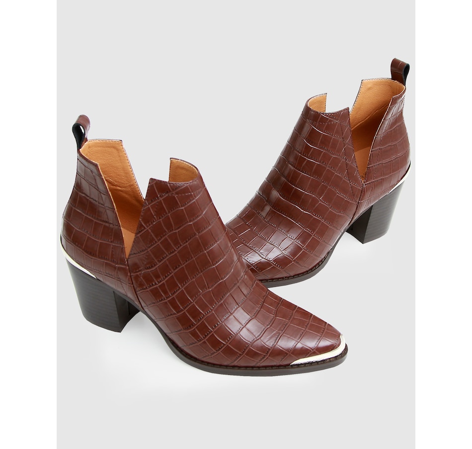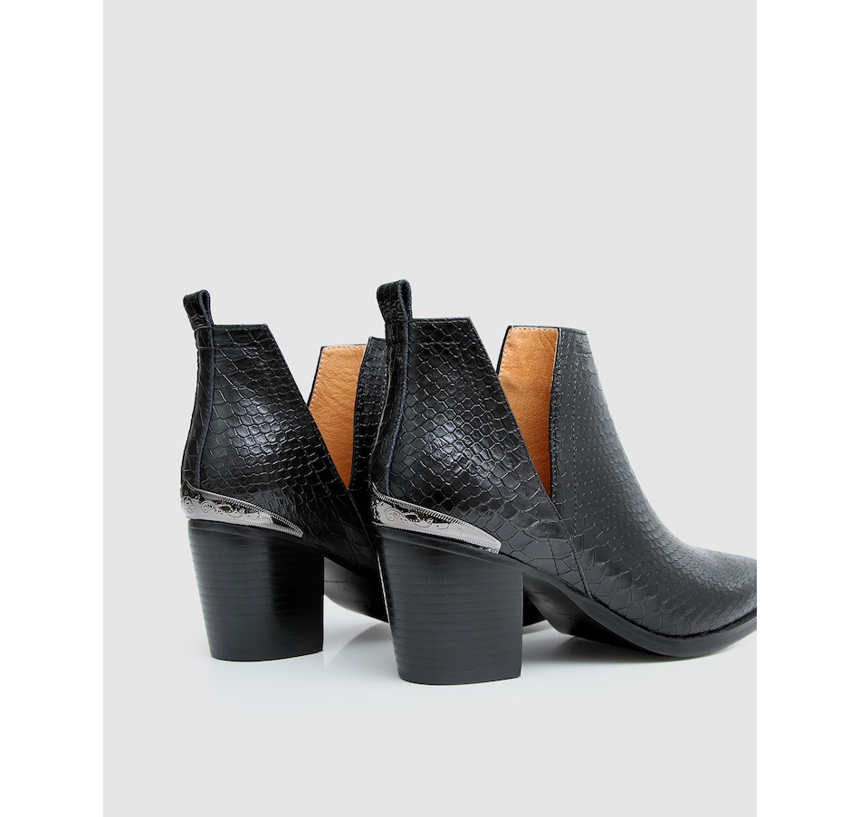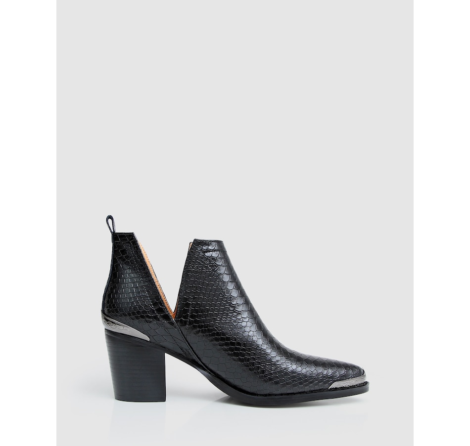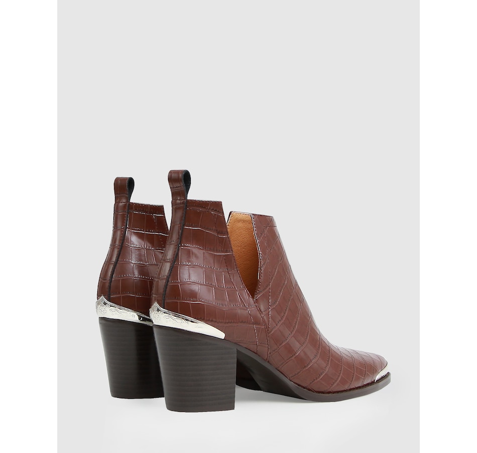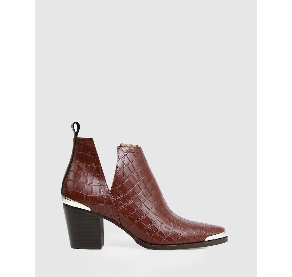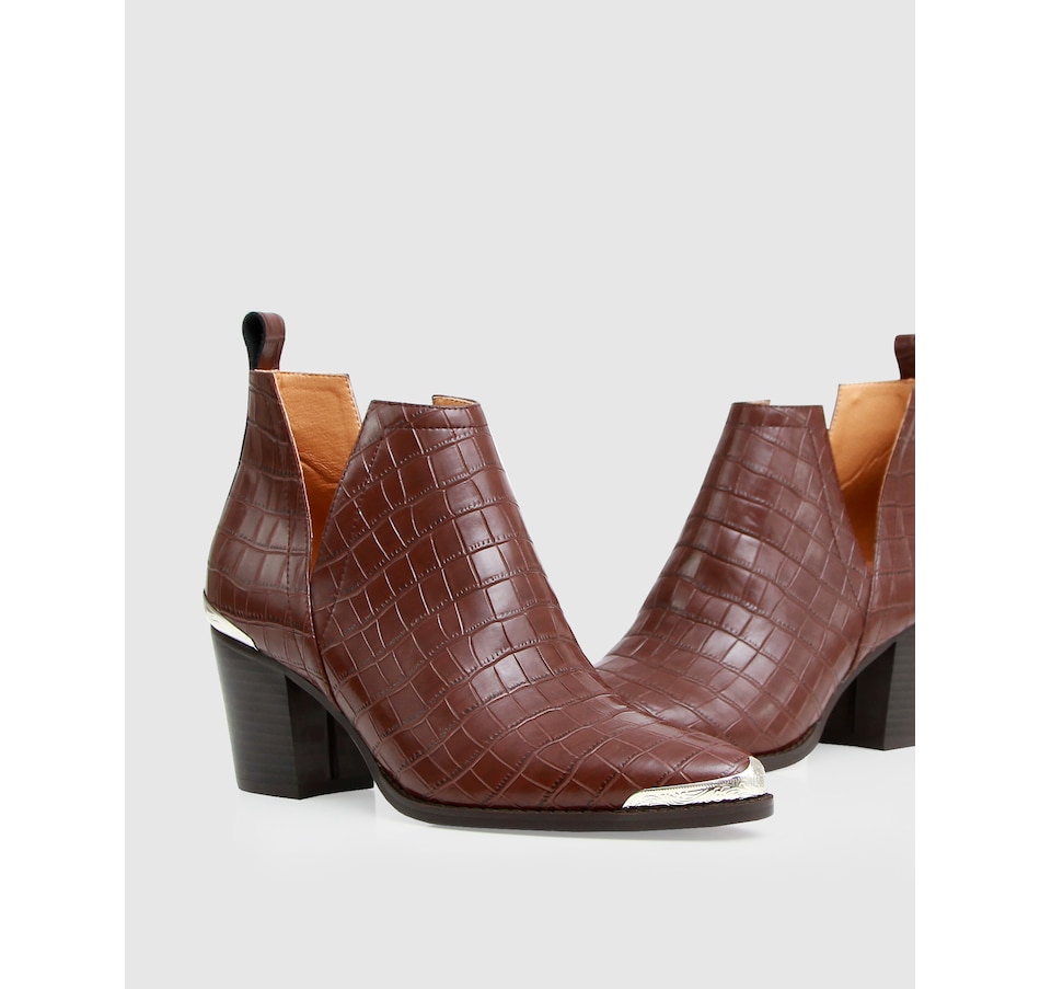 An etched metal capped heel and toe adds a dose of Western styling to the Austin Croc Embossed Ankle Boot. Grounded by a 7cm block heel, the cut-out silhouette and sleek croc embossed leather modernises the classic western features and creates a stylish addition to any outfit.