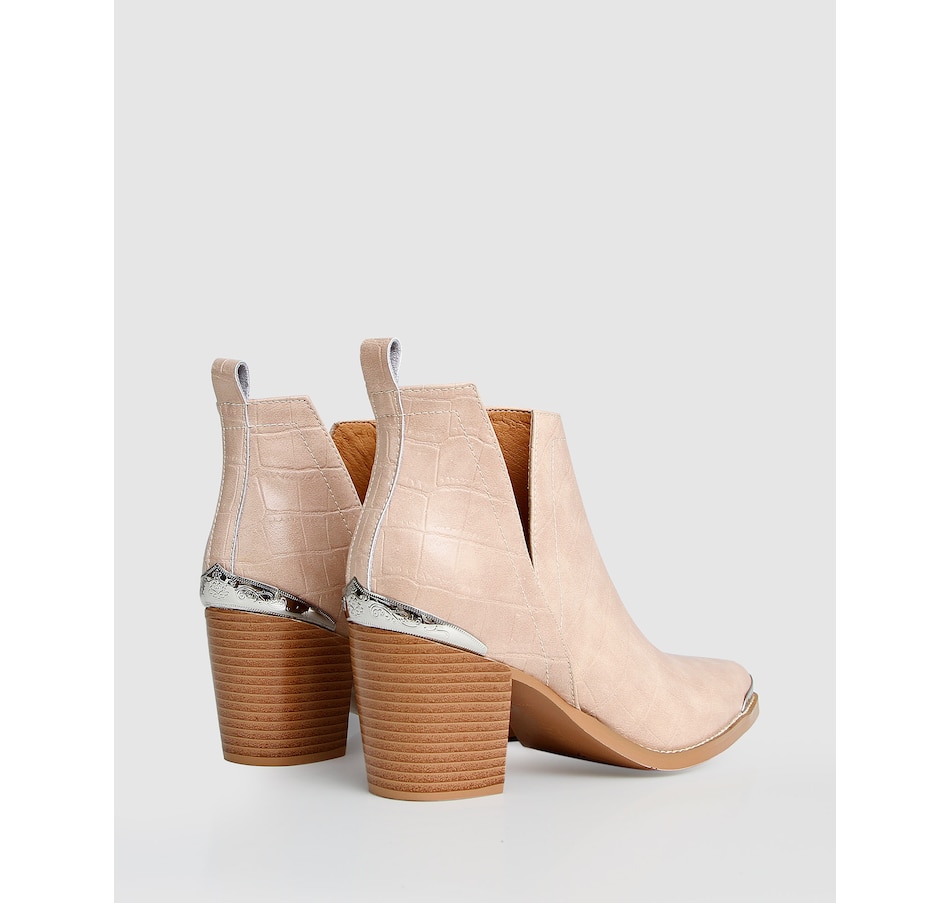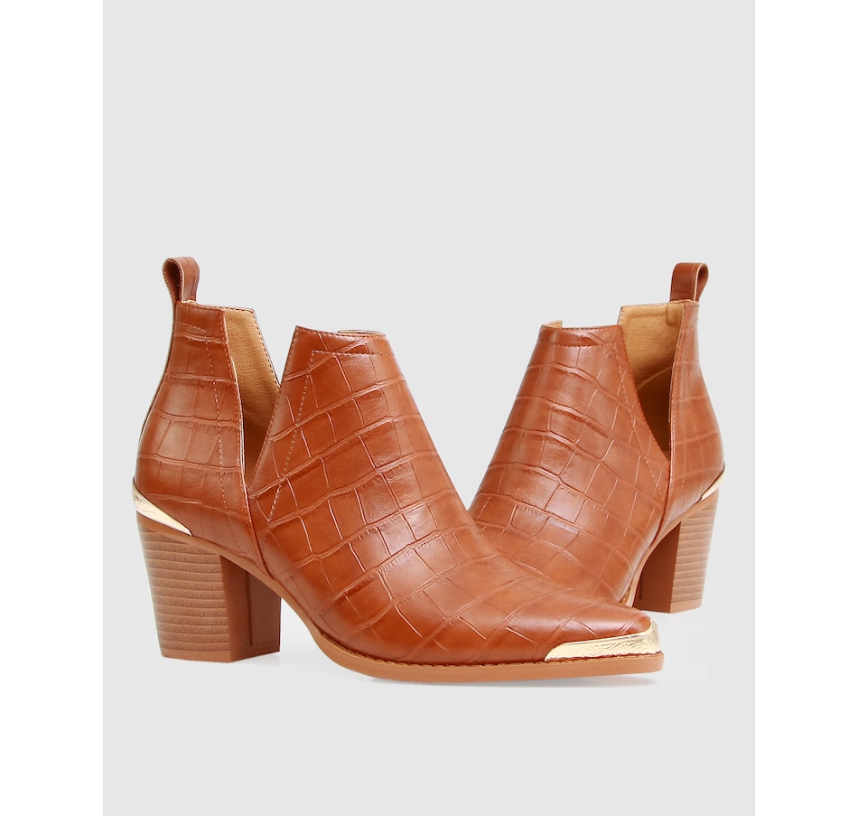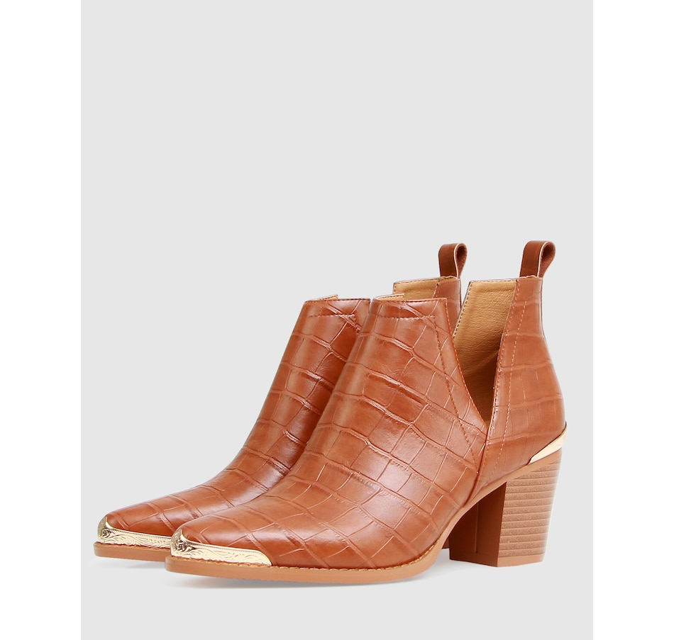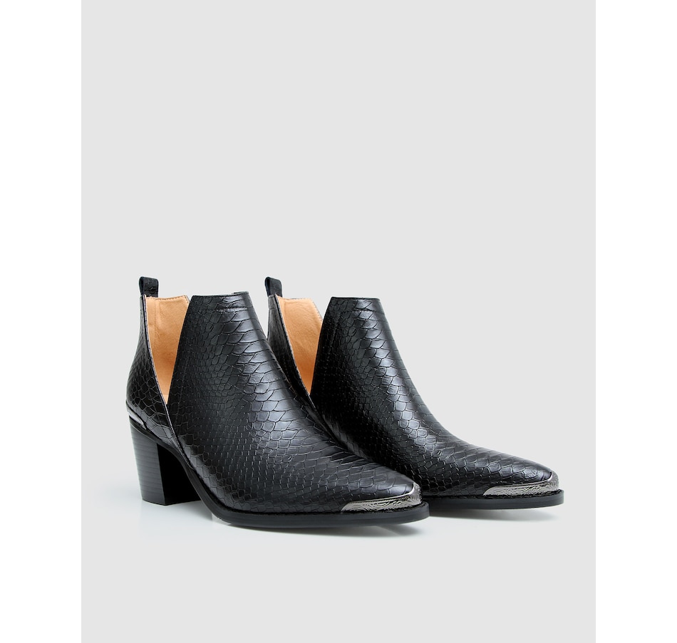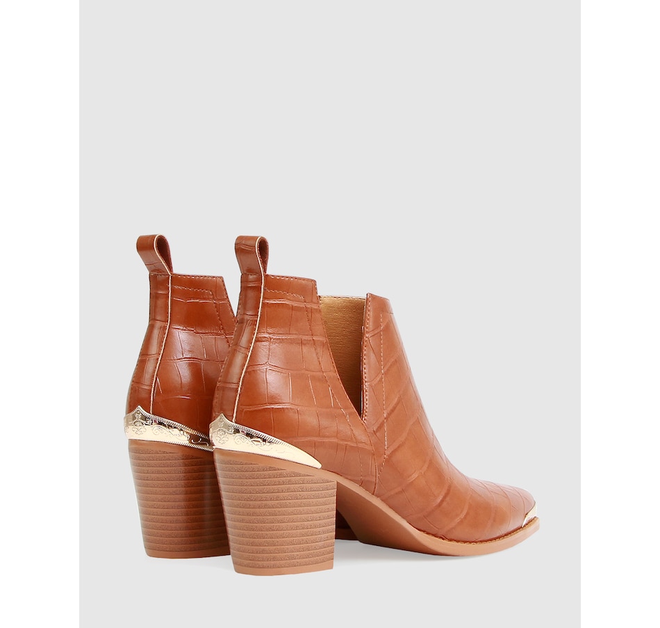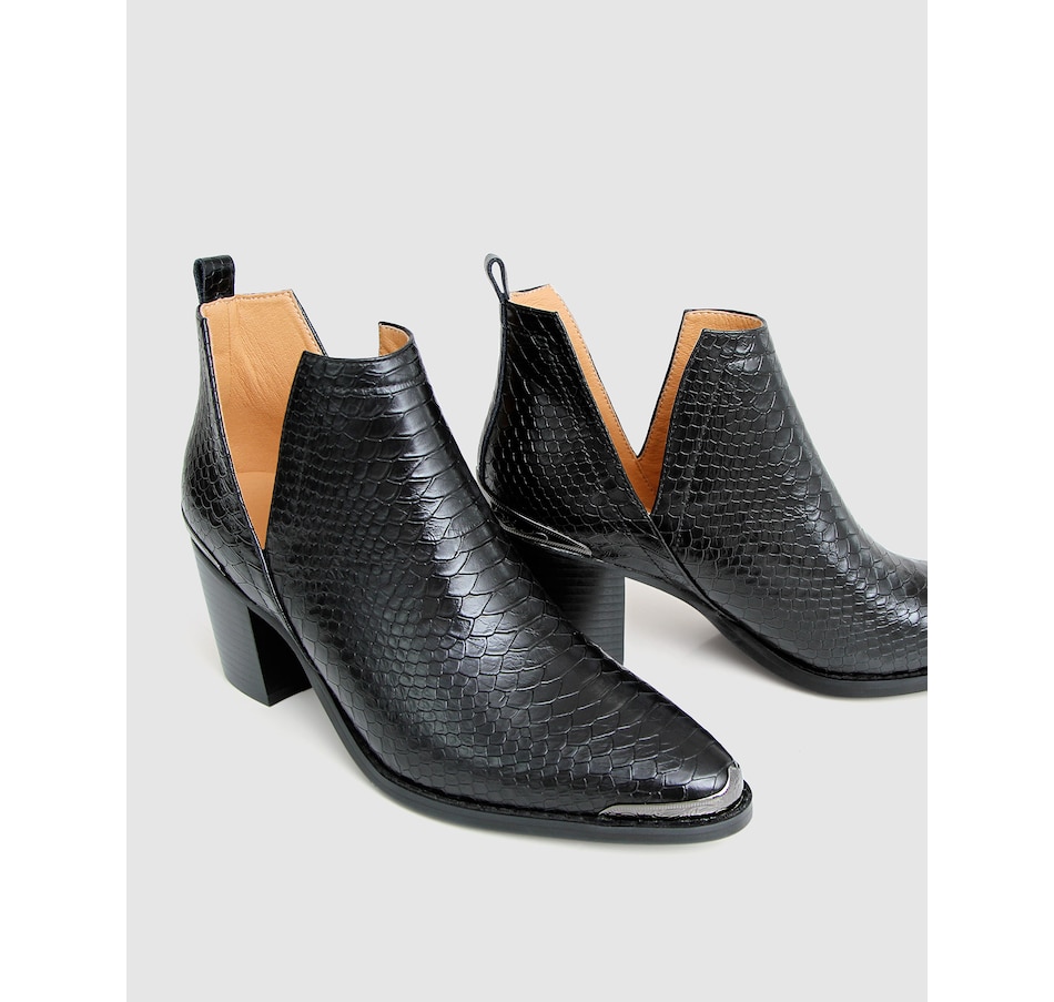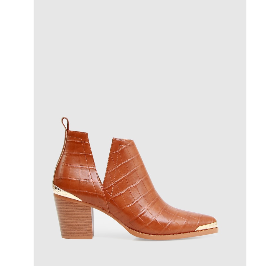 An etched metal capped heel and toe adds a dose of Western styling to the Austin Croc Embossed Ankle Boot. Grounded by a 7cm block heel, the cut-out silhouette and sleek croc embossed leather modernises the classic western features and creates a stylish addition to any outfit.