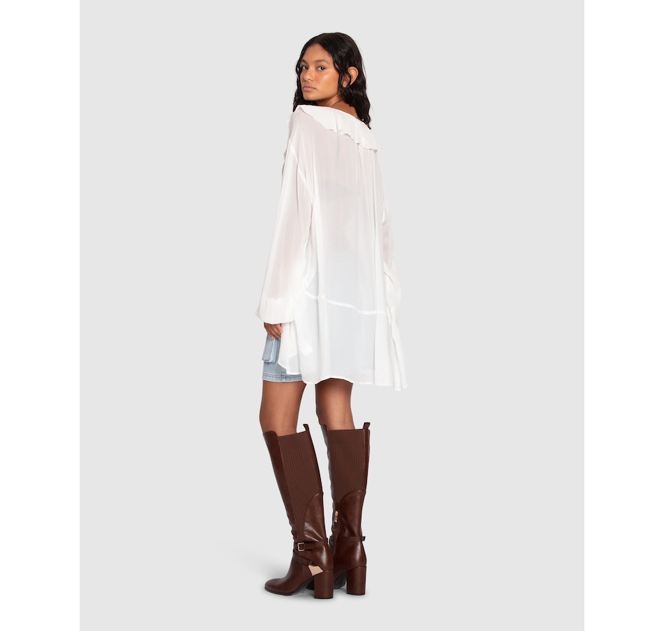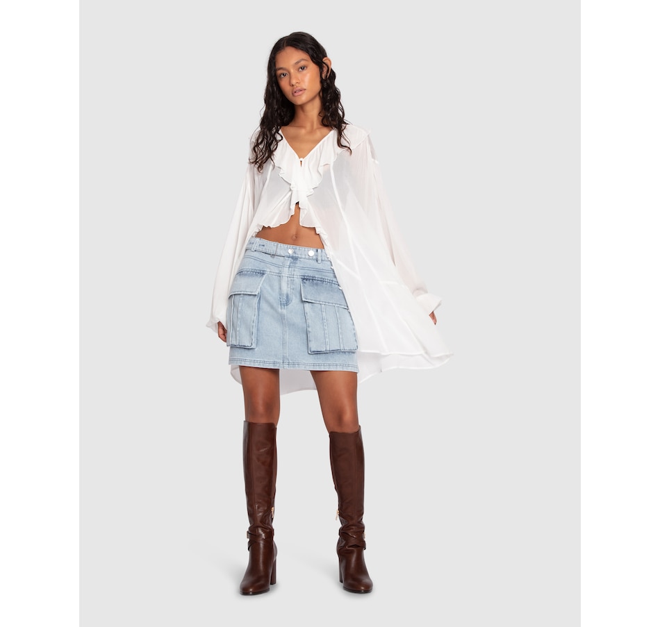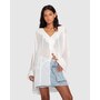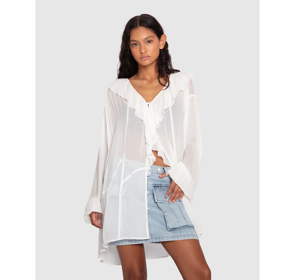 Add a little romance to your transeasonal wardrobe layering with the send love to you shirt. The button-down front, disguised by cascading ruffles can be worn open or buttoned and the sheer, floaty fabric ensures endless styling options.