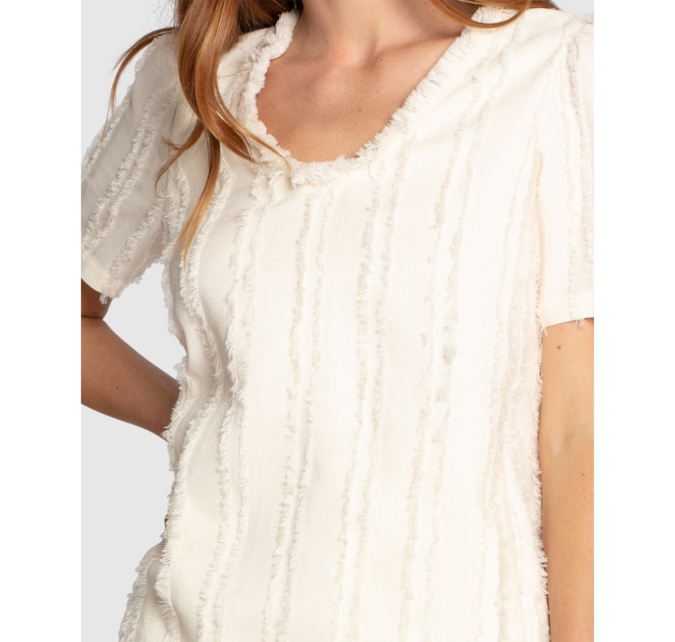 - Frayed edge V-neckline