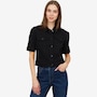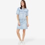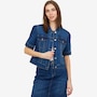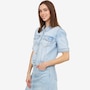 This denim jacket from claudia ev features a cropped length and finishes with a classic button closure.