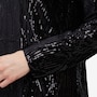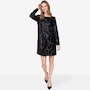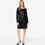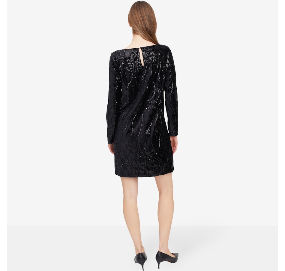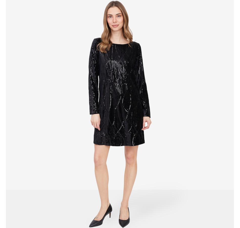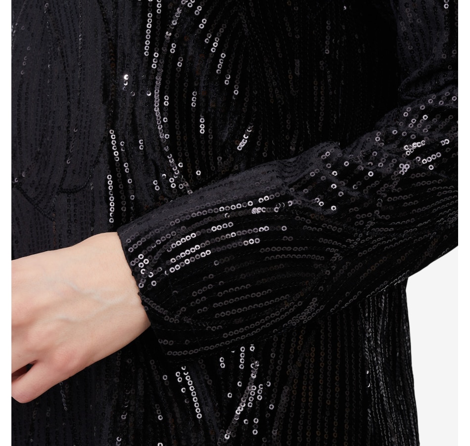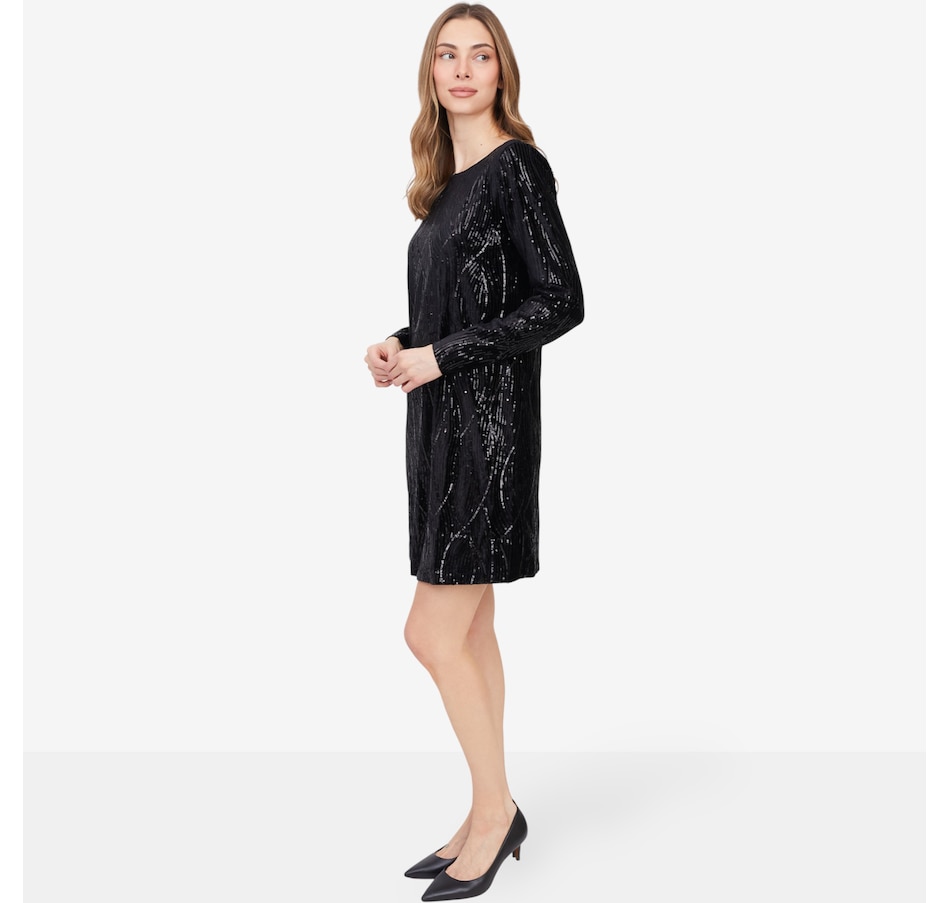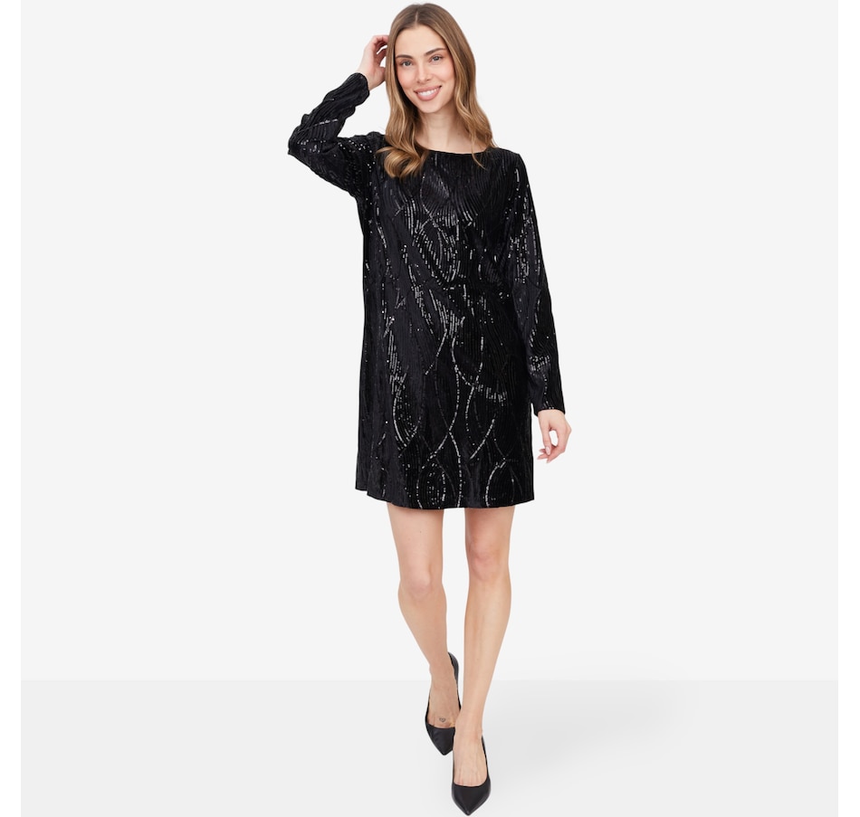 This stunning long-sleeve dress is designed to turn heads with its sequin-adorned velvet fabric, shimmering with every step. The luxurious texture exudes elegance, while the boat neckline adds a refined touch for a sophisticated silhouette. Featuring an a-line cut for graceful movement and sleek long sleeves for polished coverage, this dress is perfect for special occasions where glamour is a must. Pair it with strappy heels and statement earrings for an unforgettable look.