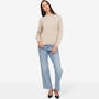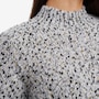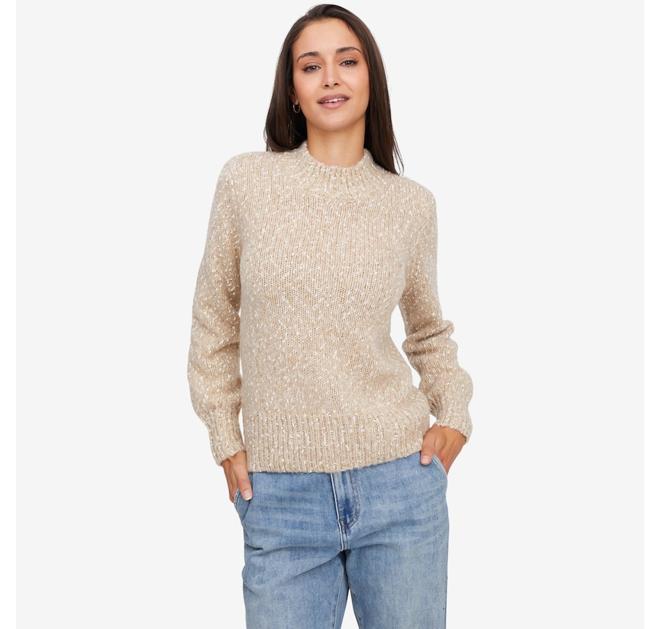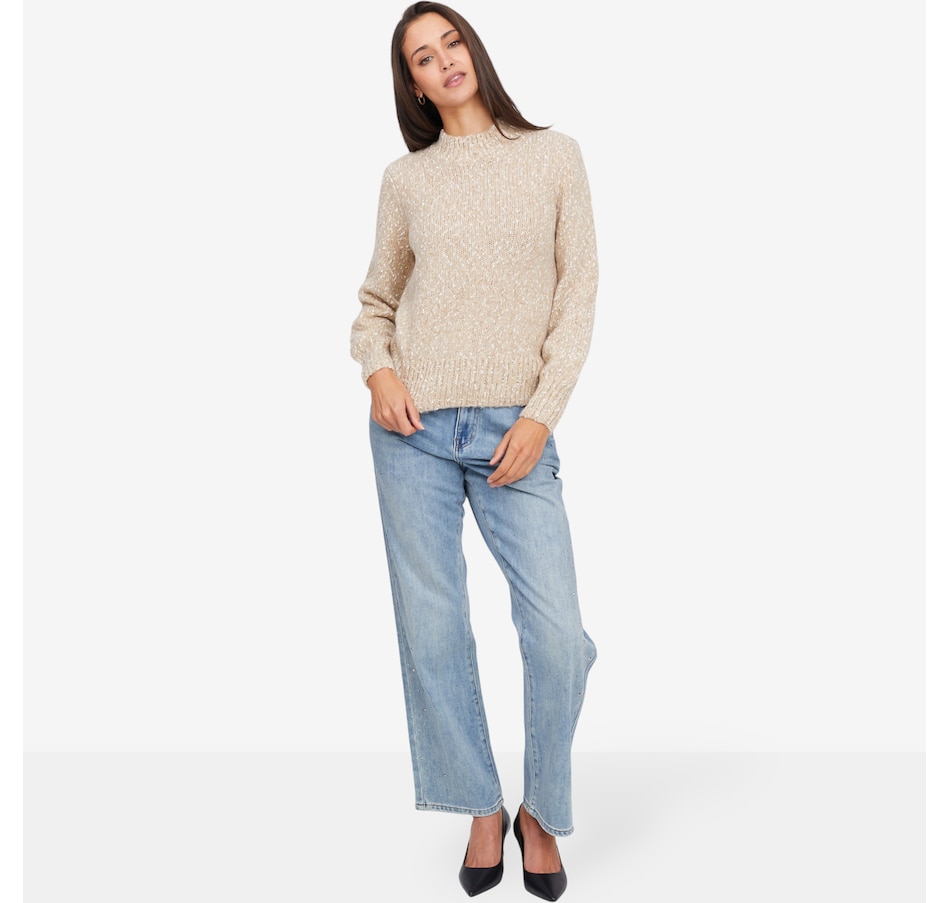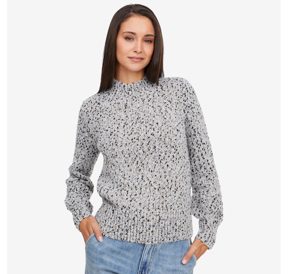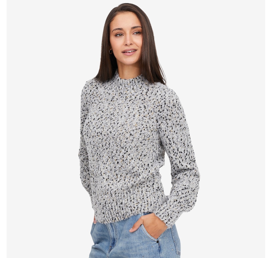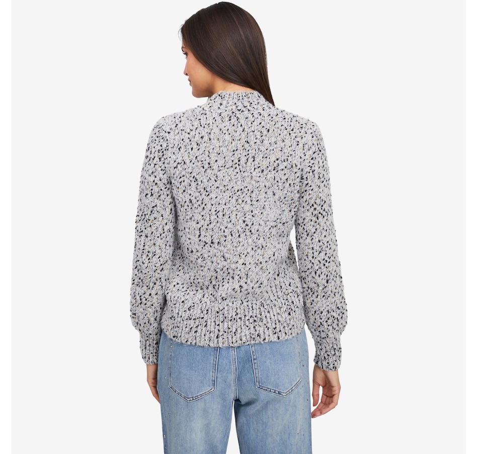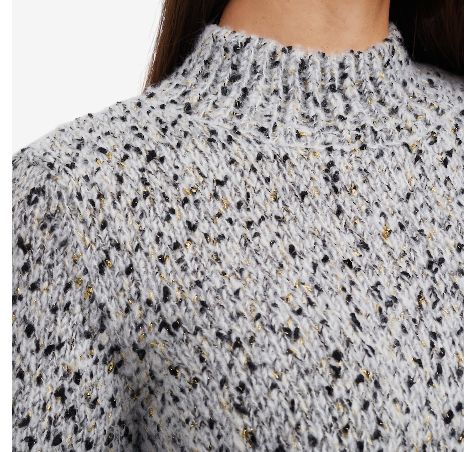 • Mock neckline, long sleeves, fitted cuffs, shine detail, novelty mixed yarn