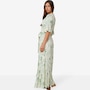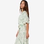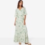 • Wrap front, short flutter sleeve, tie waist, flounce hem, printed challis fabric