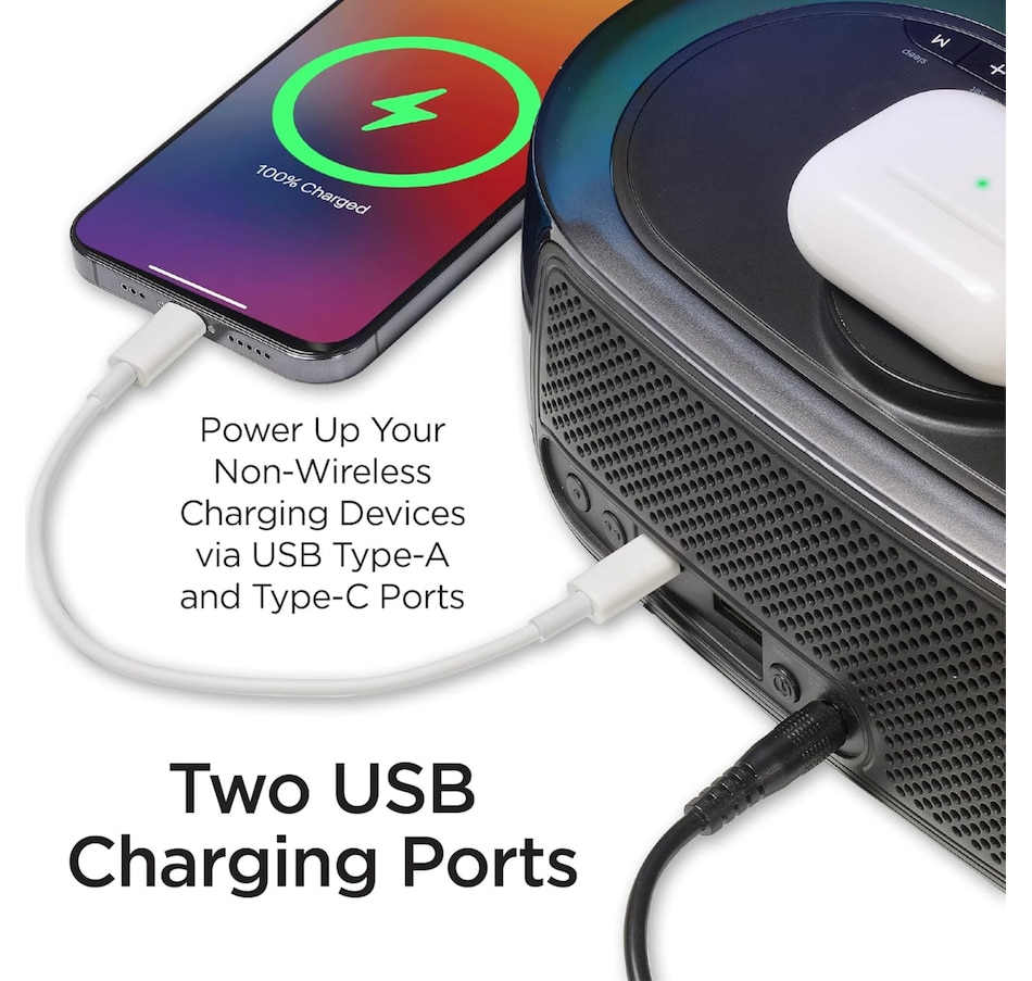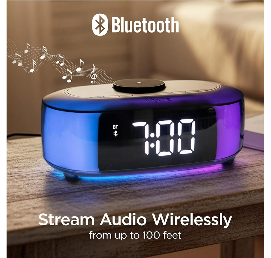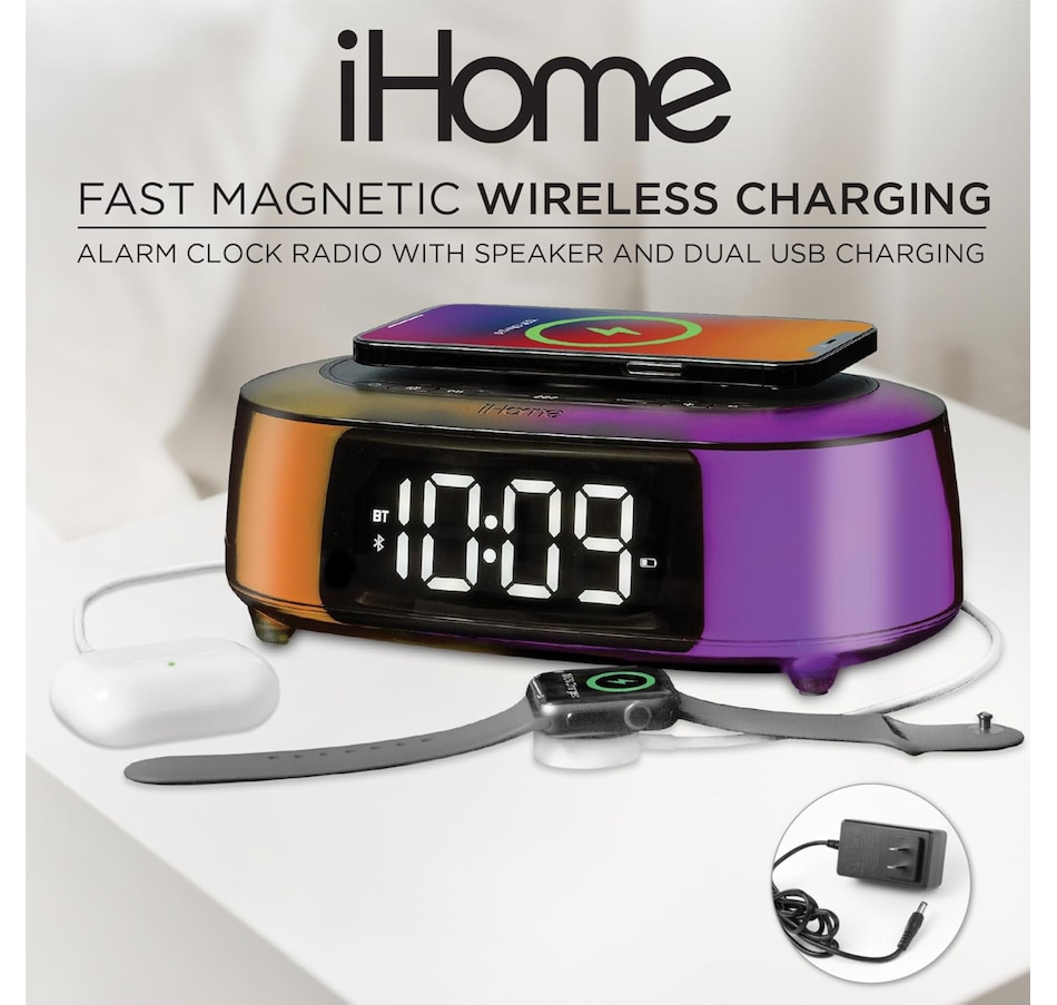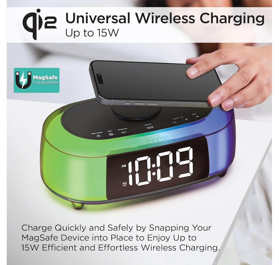 This alarm clock radio from iHome can help you personalize your sleep routine with a combination of four selectable alarm sounds, Bluetooth audio, FM radio and/or lights. It also features a Qi2 magnetic wireless charging pad that delivers up to 15W of power for any wireless or MagSafe-enabled mobile device.