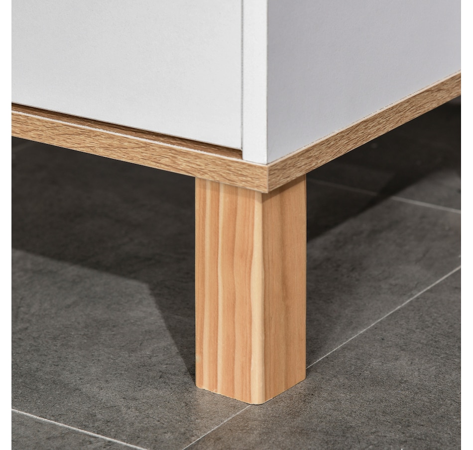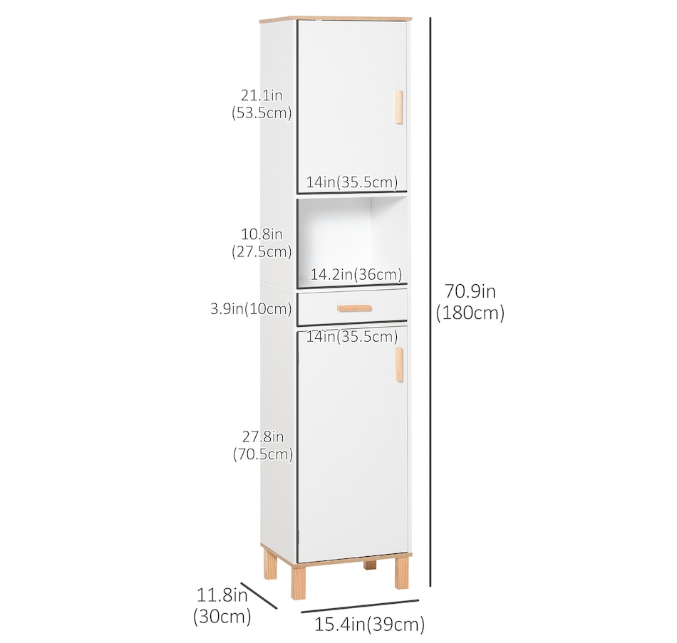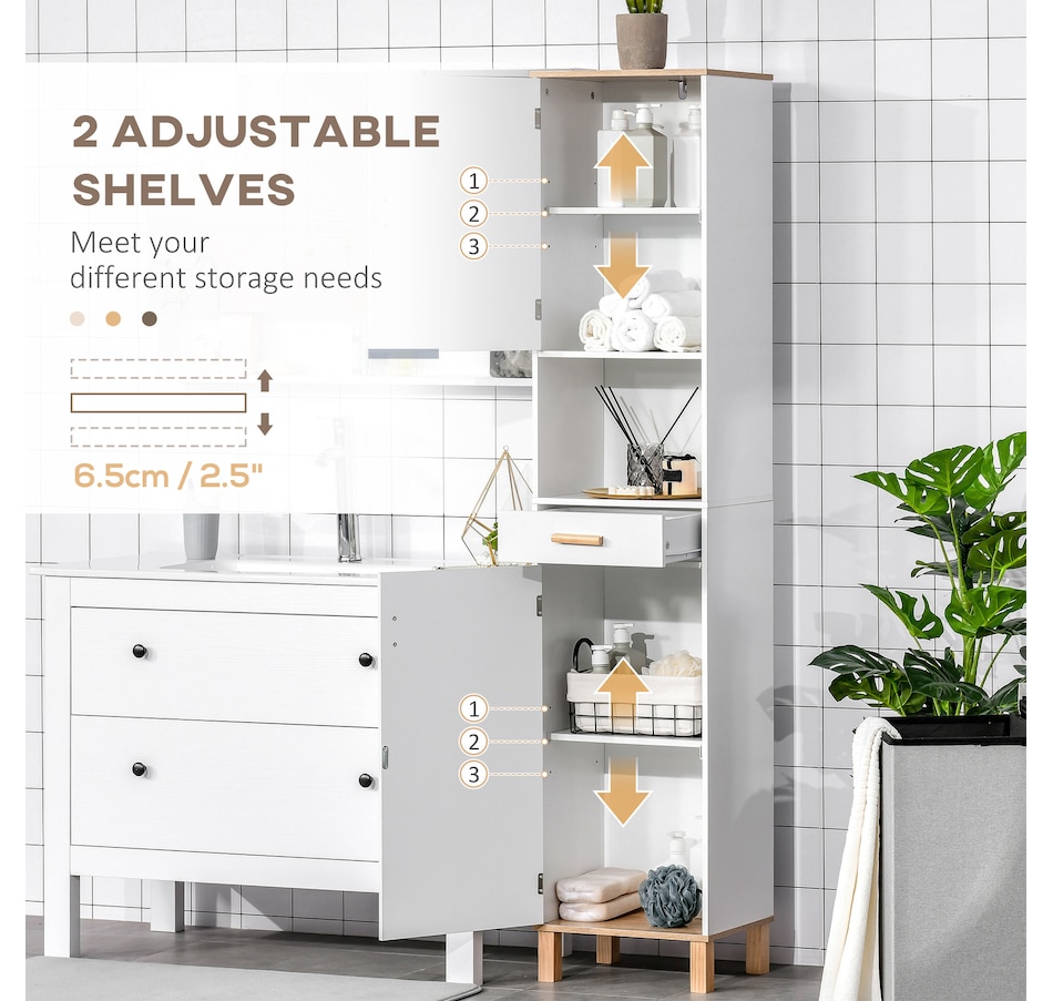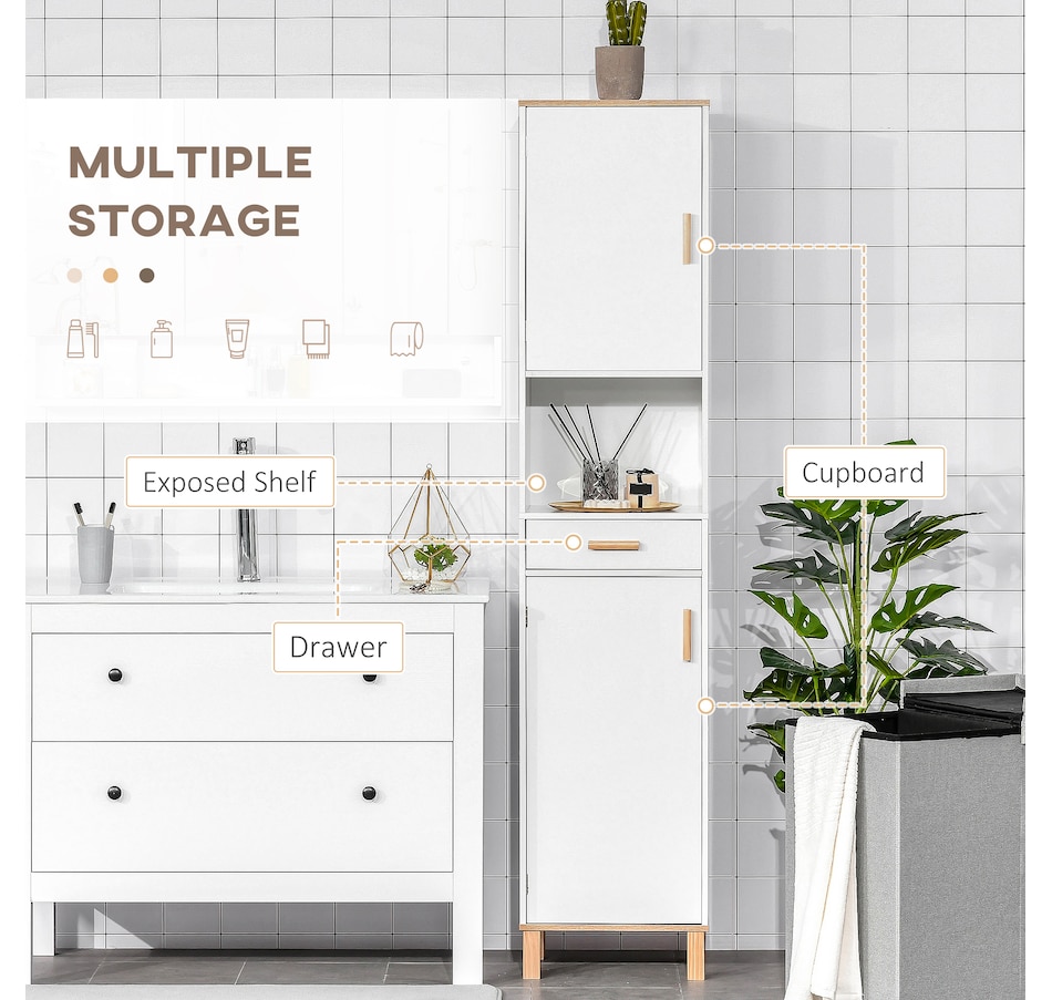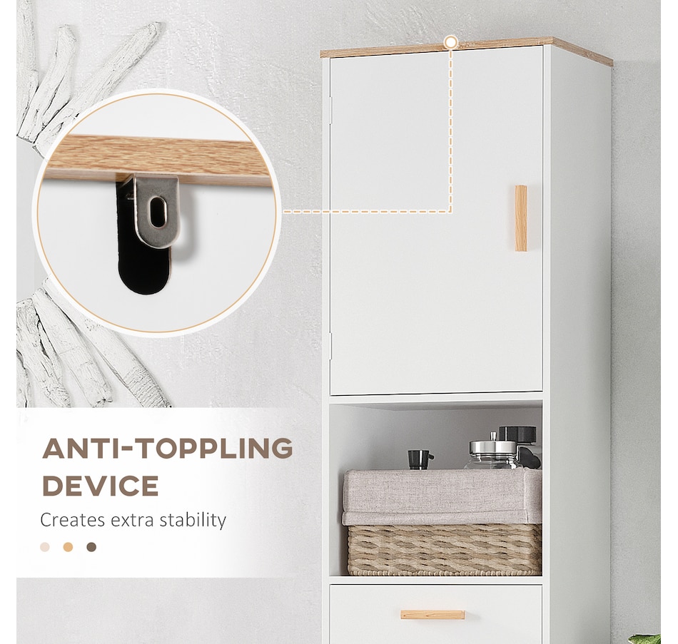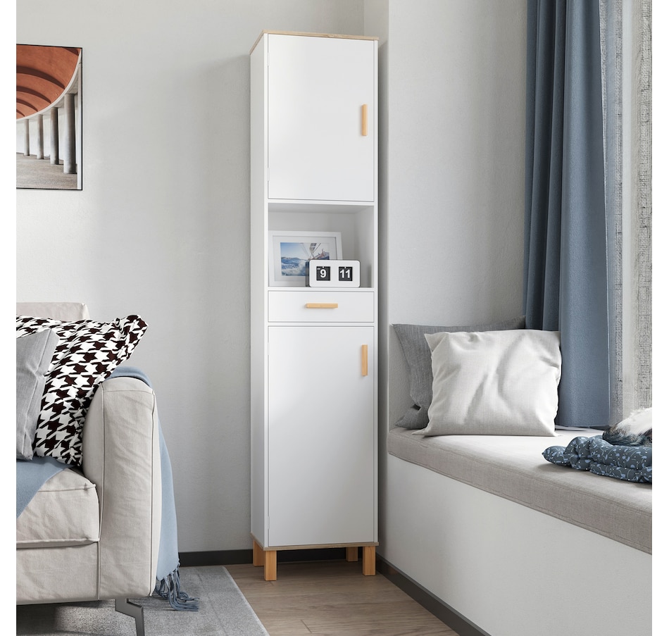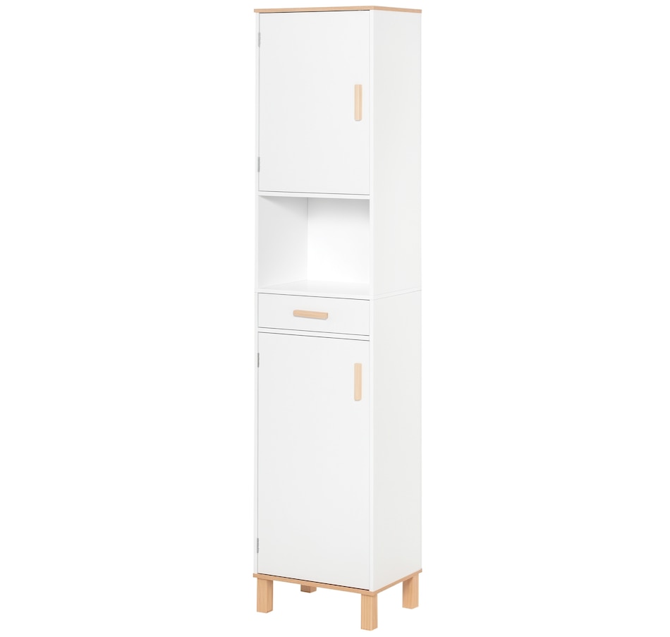 Maximize space and minimize clutter with this modern bathroom cabinet from kleankin. Made into a slim tower design, it is able to fit into tighter spaces with ease. Crafted from particle board with painted surface to ensure durability, it features 2 cabinets, 1 open shelf and a drawer, offering plenty of room to store and organize towels, toiletries and more. Making this unit ideal for use in shared households. It is finished with anti-toppling device on the back to prevent it from falling forwards.Features: