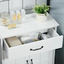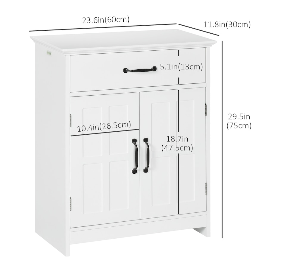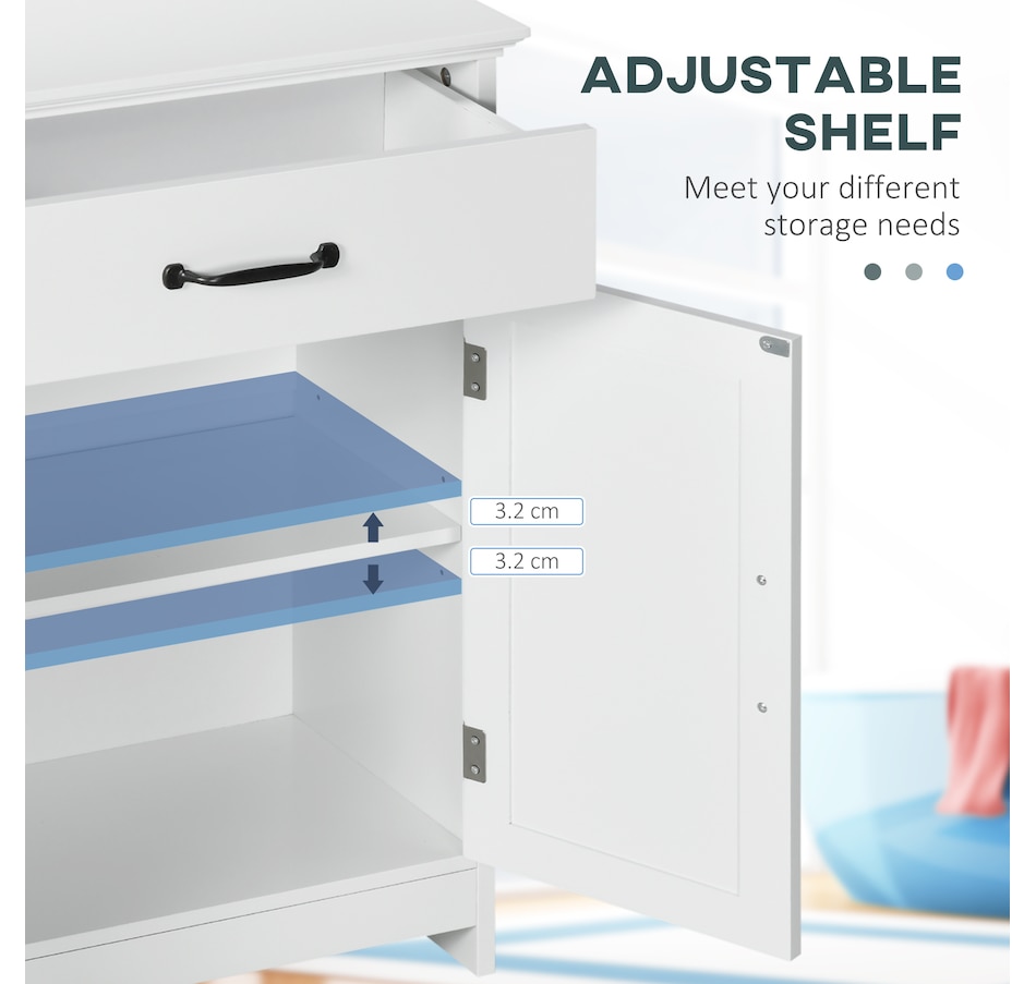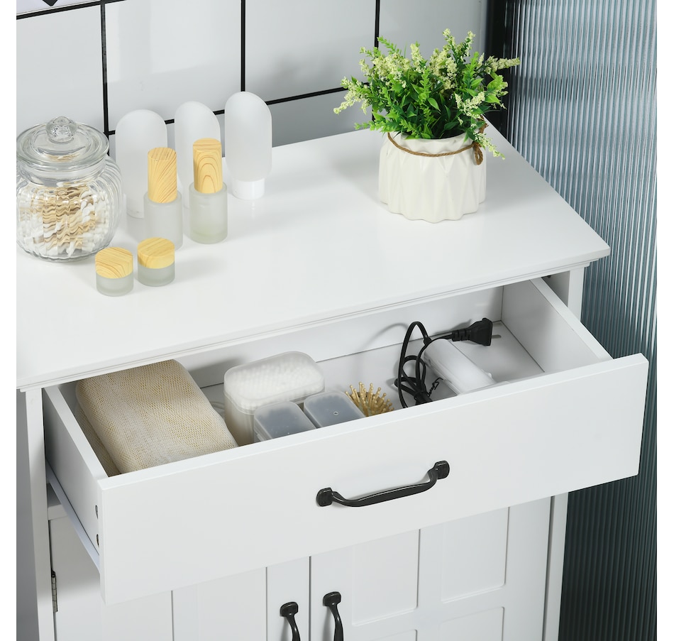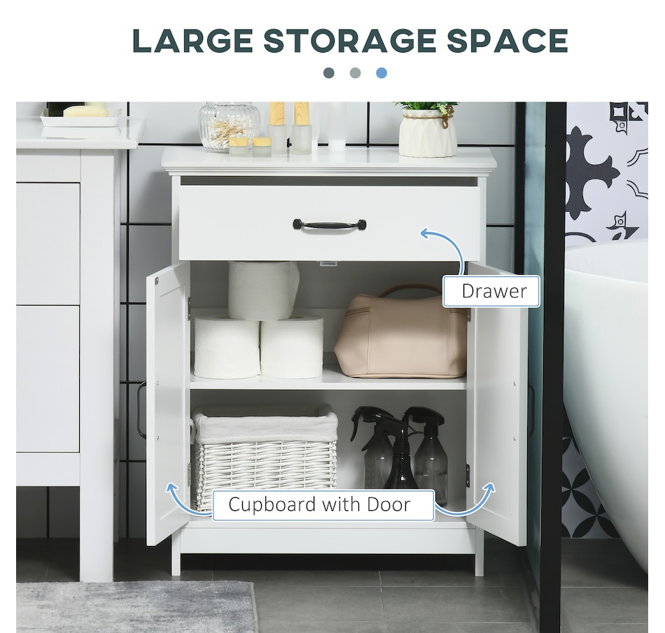 ● A drawer and enclosed cupboard neatly arranges your collection of towels, linen, and other bathroom essentials;