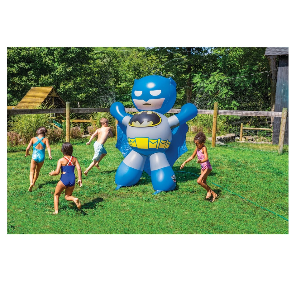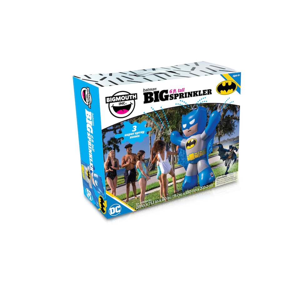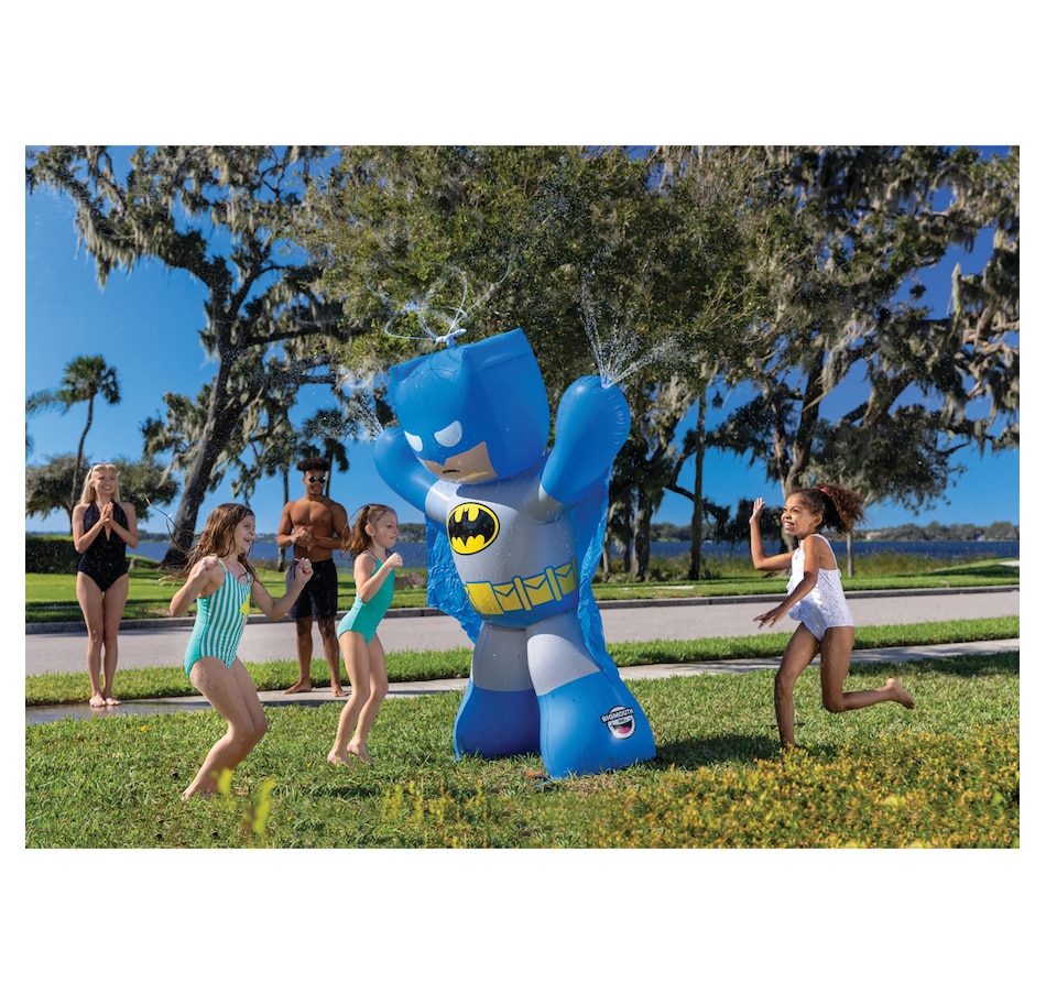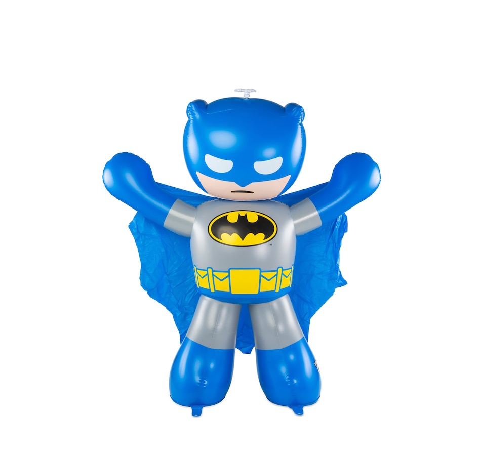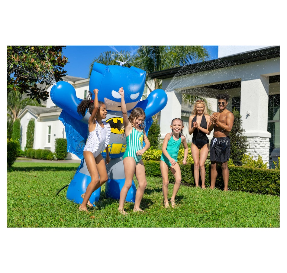 Batman is here to save the summer, sprinkler-style! The giant Batman Sprinkler is a heat-wave superhero with two splash zones and a 360-degree spinning sprinkler on top. Standing tall at 80 inches with his wings spread wide, this iconic DC character is a must for backyard play that the whole family can enjoy.