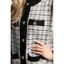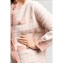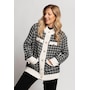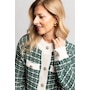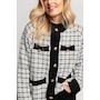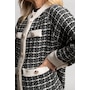 This thick weave cardigan from Katherine Karambelas is made with gold thread detailing, gold buttons, and a comfortable below the waist length. It features a drop sleeve, round neckline, front pockets and faux pockets.