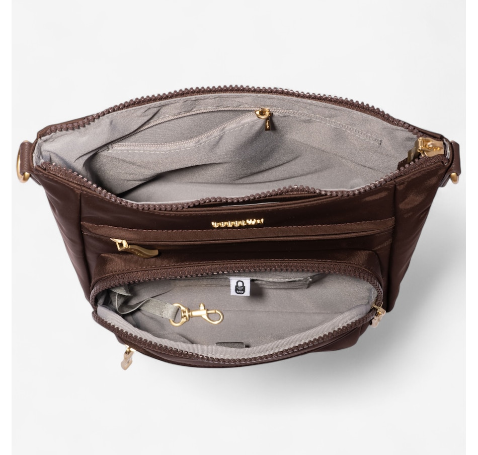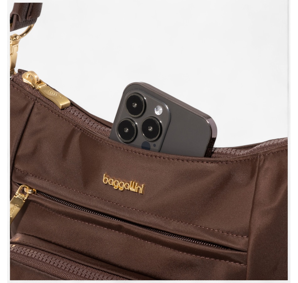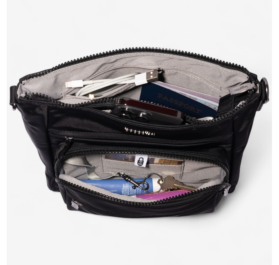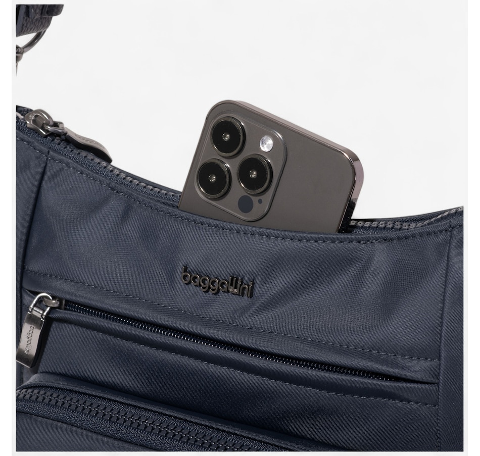 • (3) RFID-protected card slots, grab and go phone pocket, lipstick loop, privacy pocket, key leash