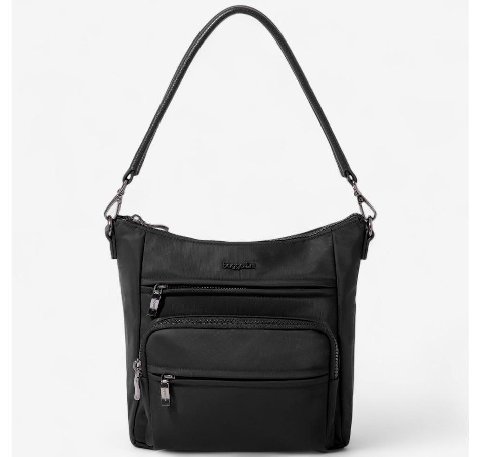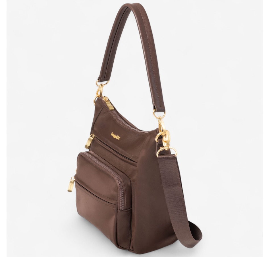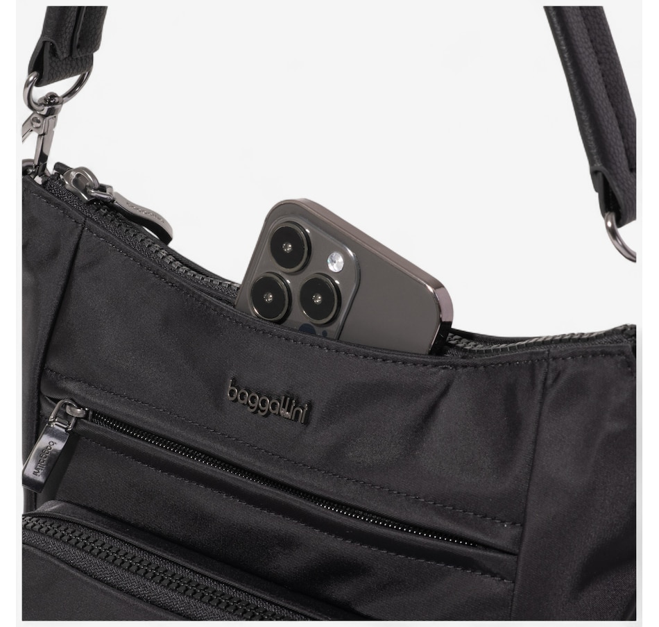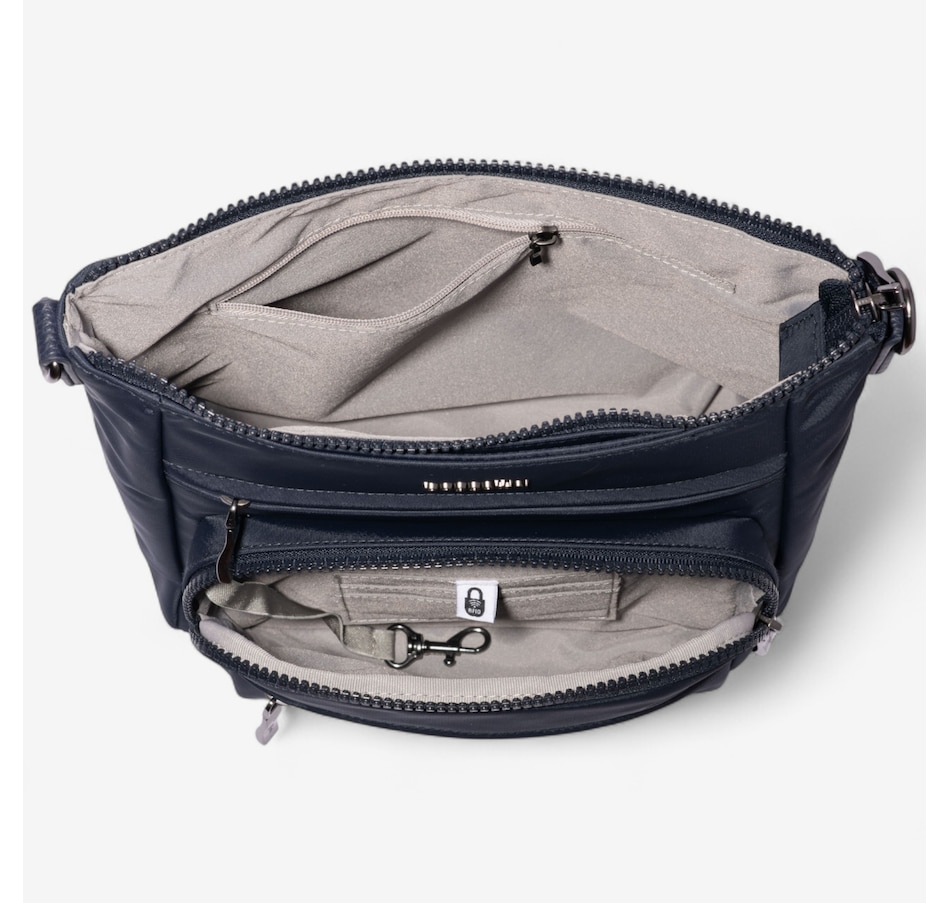 • (3) RFID-protected card slots, grab and go phone pocket, lipstick loop, privacy pocket, key leash